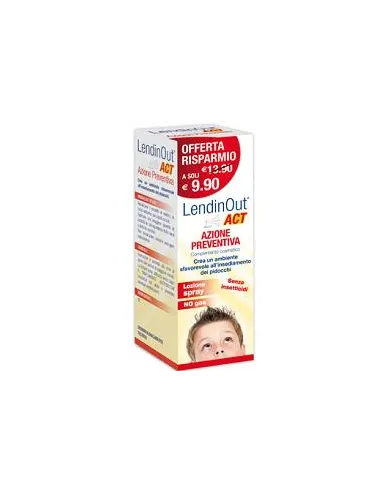 LendinOut ACT AZIONE PREVENTIVA Spray ad azione preventiva crea un ambiente sfavorevole all’insediamento dei pidocchi. Complemento cosmetico a base di estratti vegetali la cui applicazione crea, sul capo, un ambiente sfavorevole all’insediamento dei pidocchi. Gli agenti filmanti pr...