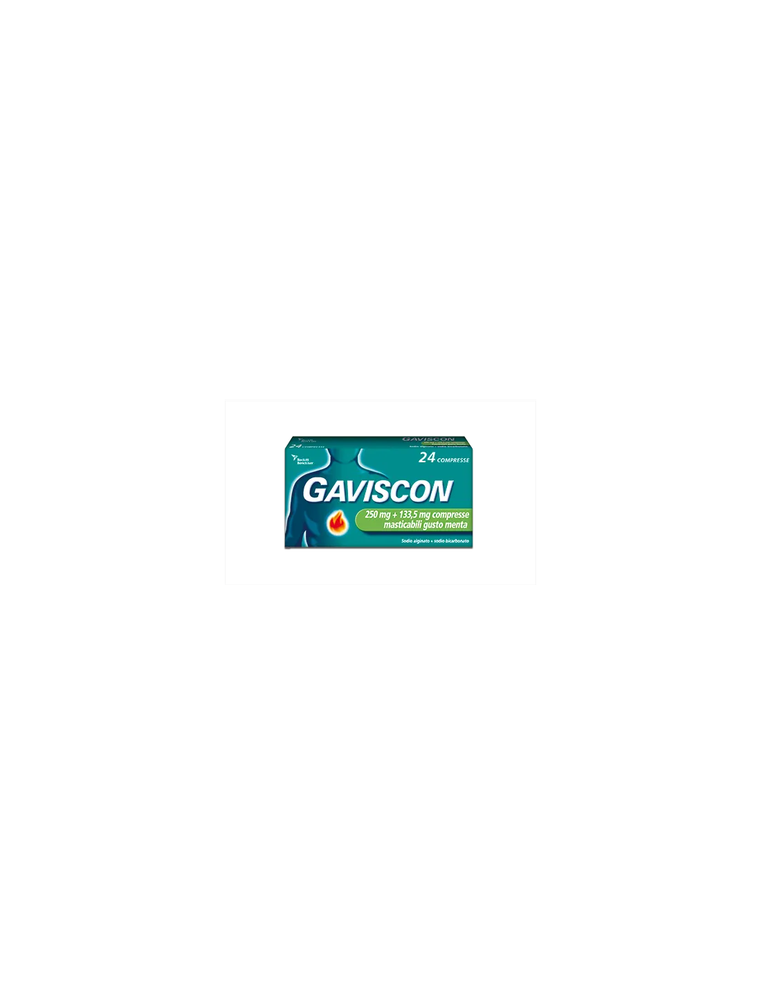 Gaviscon 500 mg + 267 mg compresse masticabili gusto menta Una compressa contiene: Principi attivi: sodio alginato 500 mg sodio bicarbonato 267 mg Eccipienti: aspartame 7,5 mg Gaviscon 250 mg + 133,5 mg compresse masticabili gusto menta Una compressa contiene: Principi attivi: sodio alginato 250 mg sodio bicarbonato 133,5 mg Eccipienti: aspartame 3.75 mg Gaviscon 250 mg + 133,5 mg compresse masticabili gusto fragola Una compressa contiene: Principi attivi: sodio alginato 250 mg sodio bicarbonato 133,5 mg Eccipienti: aspartame 8,80 mg Gaviscon 500mg/10ml + 267mg/10ml sospensione orale 10 ml contengono: Principi attivi: sodio alginato 500 mg sodio bicarbonato 267 mg Eccipienti: metile paraidrossibenzoato 40 mg propile paraidrossibenzoato 6 mg Gaviscon 500mg/10ml + 267mg/10ml sospensione orale aroma menta 10 ml contengono: Principi attivi: sodio alginato 500 mg sodio bicarbonato 267 mg Eccipienti: metile paraidrossibenzoato 40 mg propile paraidrossibenzoato 6 mg Per l’elenco completo degli eccipienti, vedere paragrafo 6.1.