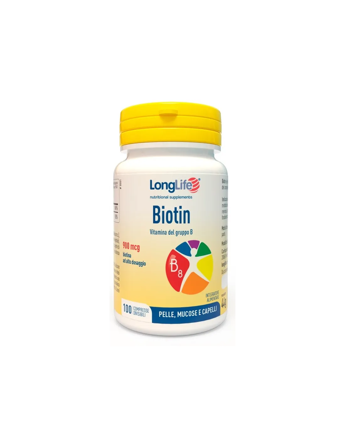 LONGLIFE SrlBiotin 900mcg è un Integratore di biotina vitamina idrosolubile indispensabile per la salute di pelle e capelli.