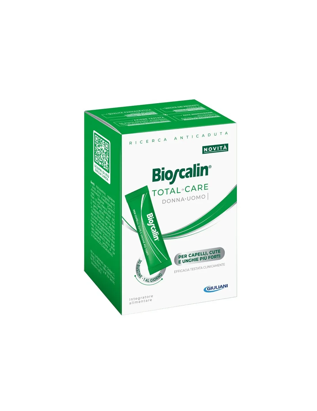 Bioscalin Total Care non si limita a prendersi cura dei capelli, ma offre un supporto completo anche per la salute di unghie e pelle. Lo zinco presente nella formulazione contribuisce al mantenimento di unghie sane e di una pelle dall'aspetto radioso. La niacina (vitamina B3) supporta la normale funzione della pelle, mentre la vitamina D3 contribuisce al benessere generale dell'organismo. Gli estratti di jiaogulan e galeopsis completano la formula, apportando ulteriori benefici per la salute degli annessi cutanei. Questo integratore è ideale per chi desidera un approccio olistico alla cura della propria bellezza, agendo dall'interno per promuovere la salute di capelli, unghie e pelle. Se desideri prenderti cura della tua bellezza a 360 gradi, Bioscalin Total Care è la scelta giusta per te. Non esitare a contattare il nostro servizio clienti per qualsiasi domanda o chiarimento.