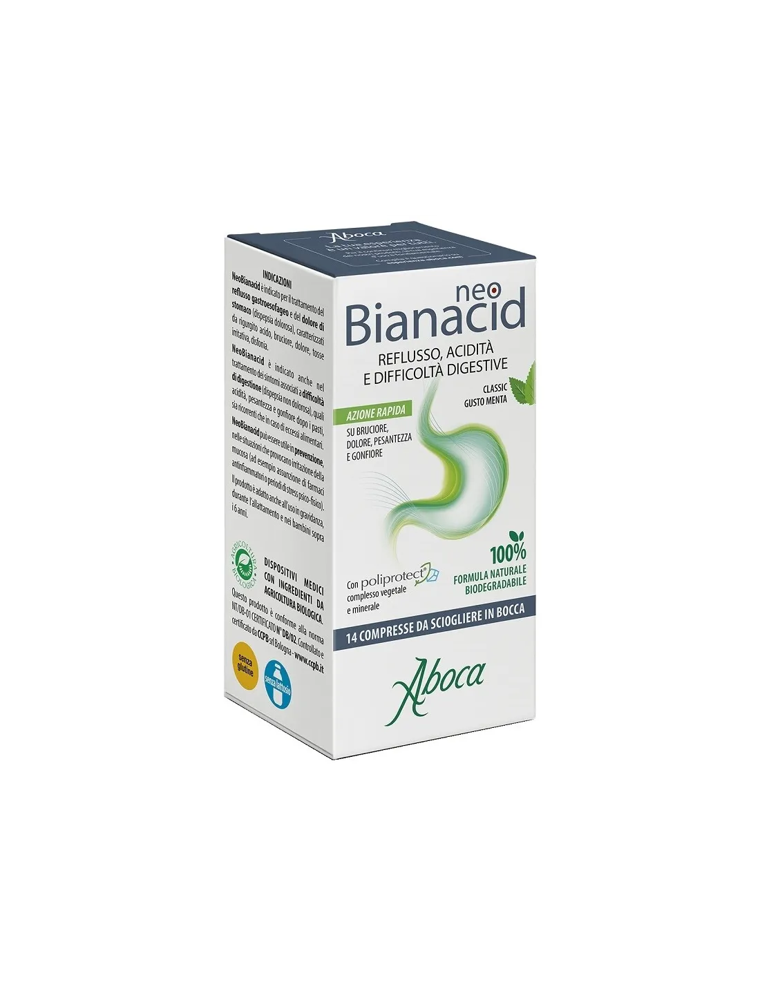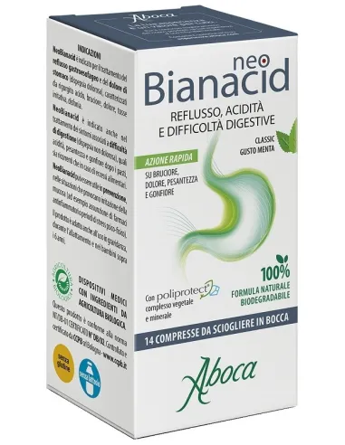 ABOCA SpA SOCIETA' AGRICOLANeoBianacid Acidità e Reflusso è un prodotto a base di complessi molecolari vegetali e minerali, che svolge un'azione protettiva e quindi lenitiva della mucosa gastro-esofagea utile per contrastare rapidamente il bruciore, il dolore, la sensazione di acidità, ovvero i sintomi tipici dell'irritazione e dell'infiammazione della mucosa stessa.