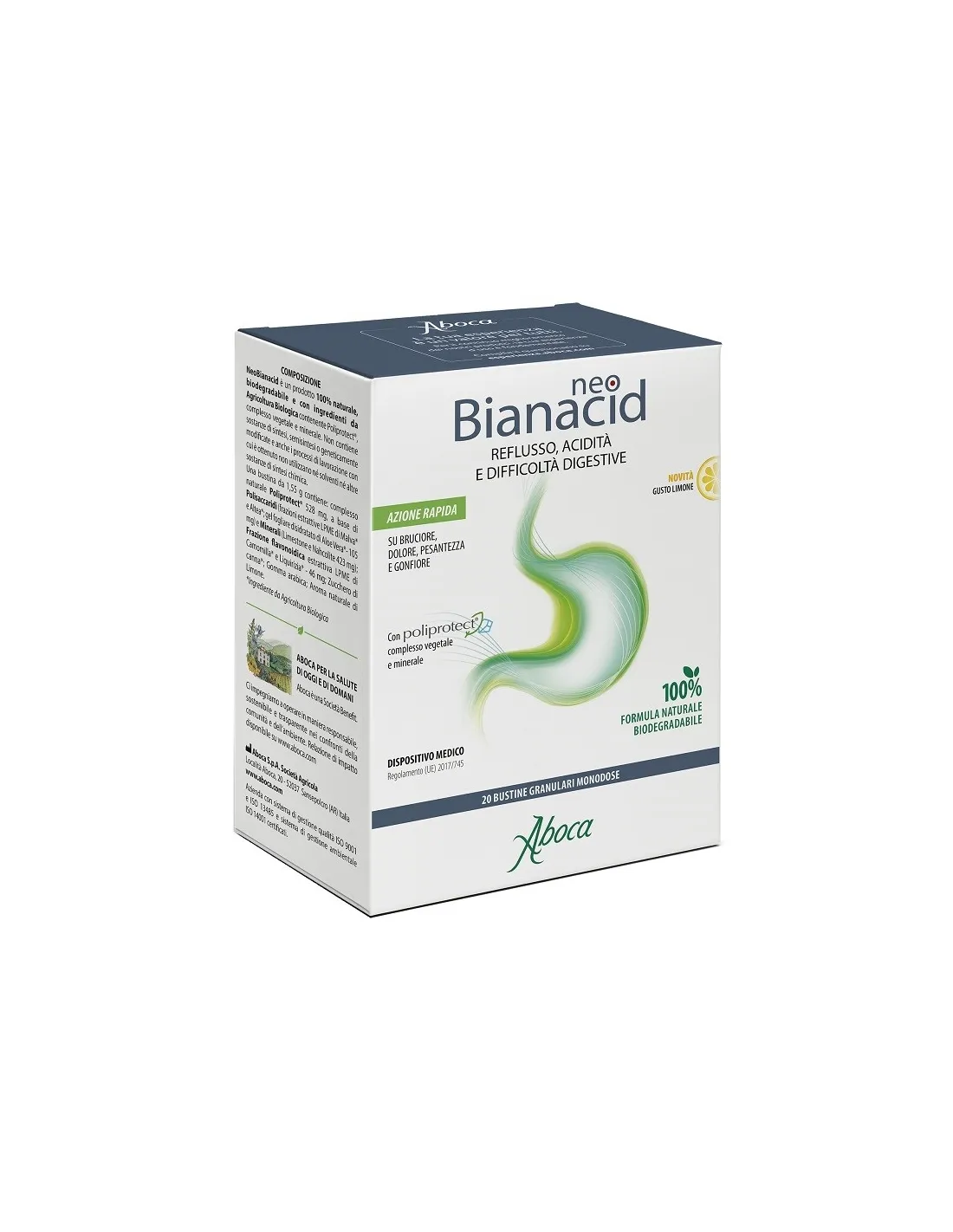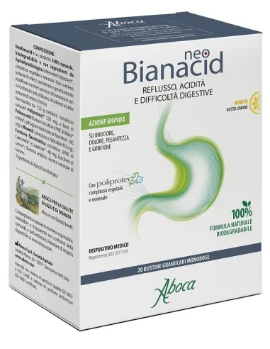 ABOCA SpA SOCIETA' AGRICOLANeoBianacid è indicato per il trattamento del reflusso gastroesofageo e del dolore di stomaco (dispepsia dolorosa), caratterizzati da rigurgito acido, bruciore, dolore, tosse irritativa, disfonia. NeoBianacid è indicato anche nel trattamento dei sintomi associati a difficoltà di digestione (dispepsia non dolorosa), quali acidità, pesantezza e gonfiore dopo i pasti, sia ricorrenti che in caso di eccessi alimentari. NeoBianacid può essere utile in prevenzione, nelle situazioni che provocano irritazione della mucosa (ad esempio assunzione di farmaci antinfiammatori o periodi di stress psico-fisico). Il prodotto è adatto anche all’uso in gravidanza, durante l’allattamento e nei bambini sopra i 6 anni.