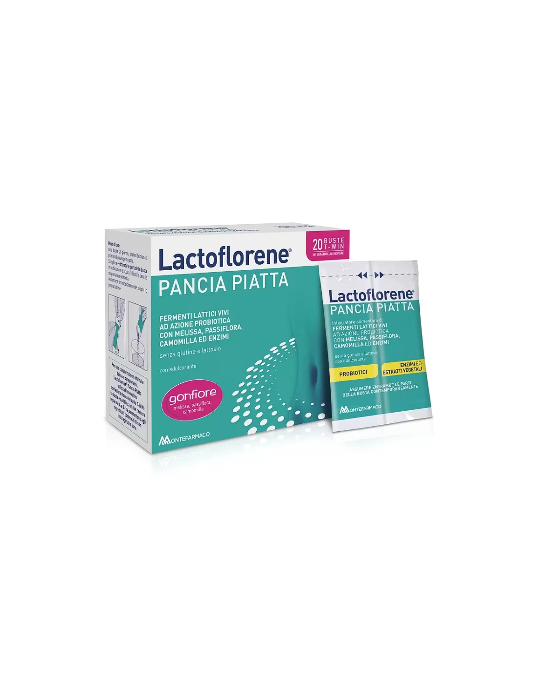 DescrizioneIntegratore alimentare con edulcorante a base di fermenti lattici vivi ad azione probiotica, enzimi e estratti vegetali melissa, camomilla, passiflora e zenzero, utile per favorire l’equilibrio della flora intestinale, favorire la regolare motilità intestinale, aiutare l’eliminazione dei gas responsabili del gonfiore addominale, favorire la funzione digestiva, favorire il rilassamento e il benessere mentale, normalizzando il tono dell’umore.