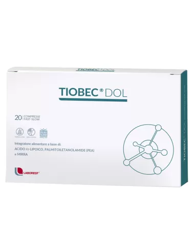 LABOREST TIOBEC DOL INTEGRATORE ALIMENTARE SENZA GLUTINE E LATTOSIO 20 COMPRESSE Tiobec Dol è un integratore e alimentare a base di Acido α-Lipoico, Palmitoiletanolamide (PEA) e Mirra, utile in presenza di carenze alimentari o aumentati fabbisogni. Tiobec Dol compresse è indicato in caso di aumenta...