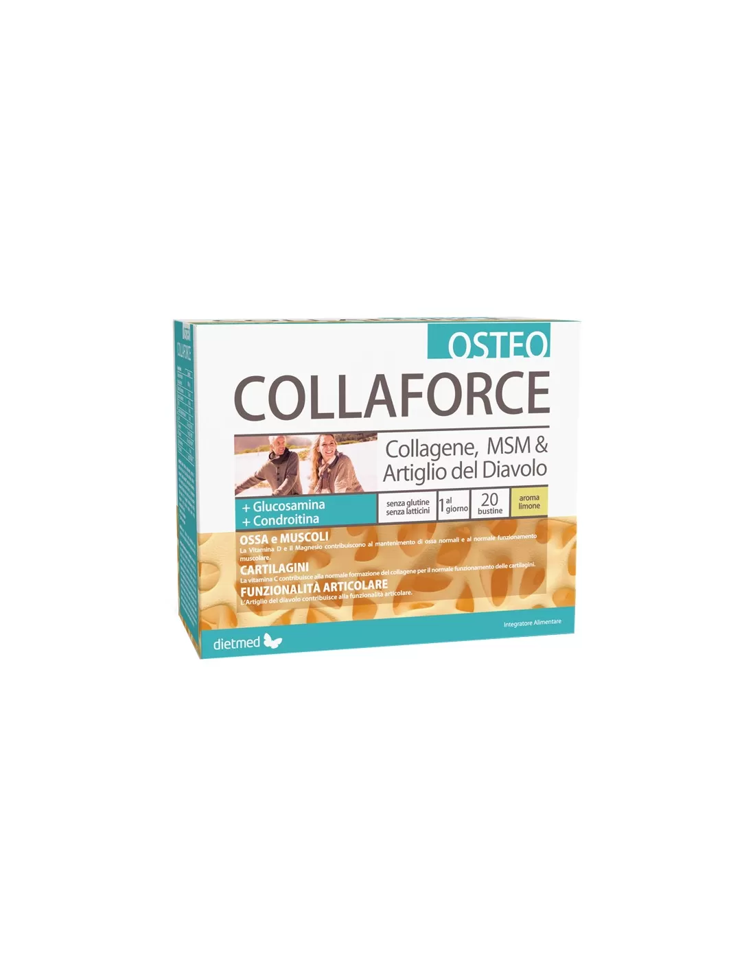 pesce), aroma di limone, maltodestrina, ossido di magnesio, acido L-ascorbico (vitamina C), Harpagophytum procumbens DC (artiglio del diavolo, estratto secco di radici secondarie titolato minimo al 2% in arpagosidi), metilsulfonilmetano (MSM), ialuronato di sodio; edulcoranti: sucralosio, saccarina sodica; colecalciferolo (vitamina D).