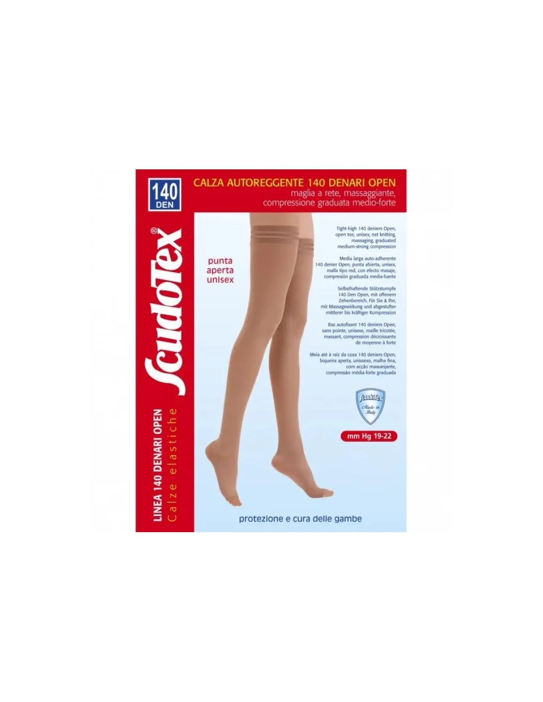 In campo angiologico e vascolare vi è la tendenza tesa a favorire l'uso di calze elastiche a compressione graduata con una maglia più leggera rispetto alle tradizionali calze medicali tramate, purché sia assicurato un significativo valore elasto-compressivo. L'utilizzo di filati dalle caratteristiche innovative ci consentono di proporre la speciale linea di calze elastiche Scudotex a punta aperta, maglia a rete, semitrasparenti, che assicurano una confortevole vestibilità ed un’ efficace e duratura compressione graduata media, medio-forte e forte che le rende indicate anche nei casi più gravi di insufficienza venosa. La punta aperta, oltre a permettere l'ispezione del piede, corrisponde alle esigenze delle persone con patologie venose agli arti inferiori, che presentano disturbi alle dita e alle unghie dei piedi con conseguente difficoltà ad indossare calze elastiche con il puntale. Calze elastiche Scudotex a punta aperta realizzate con filati elastici finissimi, con doppia ricopertura e lavorazione a maglia a rete o a nido d’ape che, oltre a favorire la traspirazione cutanea permettono, attraverso l’estensibilità trasversale e longitudinale della maglia, di ottenere un’efficace compressione graduata decrescente dal basso verso l’alto. Tallone rinforzato che assicura il giusto posizionamento della calza in caviglia e la corretta compressione lungo la gamba. Cuciture piatte che ne accrescono l’estetica e la durata. Confortevoli e ben tollerate da chi le indossa, sono in grado di esercitare una salutare azione massaggiante e tonificante sulle gambe ed assicurare significativi benefici nella prevenzione e la cura dell’Insufficienza Venosa Cronica.