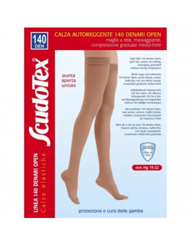 In campo angiologico e vascolare vi è la tendenza tesa a favorire l'uso di calze elastiche a compressione graduata con una maglia più leggera rispetto alle tradizionali calze medicali tramate, purché sia assicurato un significativo valore elasto-compressivo. L'utilizzo di filati dalle caratteristiche innovative ci consentono di proporre la speciale linea di calze elastiche Scudotex a punta aperta, maglia a rete, semitrasparenti, che assicurano una confortevole vestibilità ed un’ efficace e duratura compressione graduata media, medio-forte e forte che le rende indicate anche nei casi più gravi di insufficienza venosa. La punta aperta, oltre a permettere l'ispezione del piede, corrisponde alle esigenze delle persone con patologie venose agli arti inferiori, che presentano disturbi alle dita e alle unghie dei piedi con conseguente difficoltà ad indossare calze elastiche con il puntale. Calze elastiche Scudotex a punta aperta realizzate con filati elastici finissimi, con doppia ricopertura e lavorazione a maglia a rete o a nido d’ape che, oltre a favorire la traspirazione cutanea permettono, attraverso l’estensibilità trasversale e longitudinale della maglia, di ottenere un’efficace compressione graduata decrescente dal basso verso l’alto. Tallone rinforzato che assicura il giusto posizionamento della calza in caviglia e la corretta compressione lungo la gamba. Cuciture piatte che ne accrescono l’estetica e la durata. Confortevoli e ben tollerate da chi le indossa, sono in grado di esercitare una salutare azione massaggiante e tonificante sulle gambe ed assicurare significativi benefici nella prevenzione e la cura dell’Insufficienza Venosa Cronica.