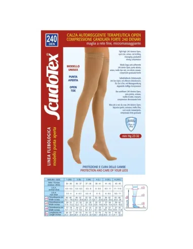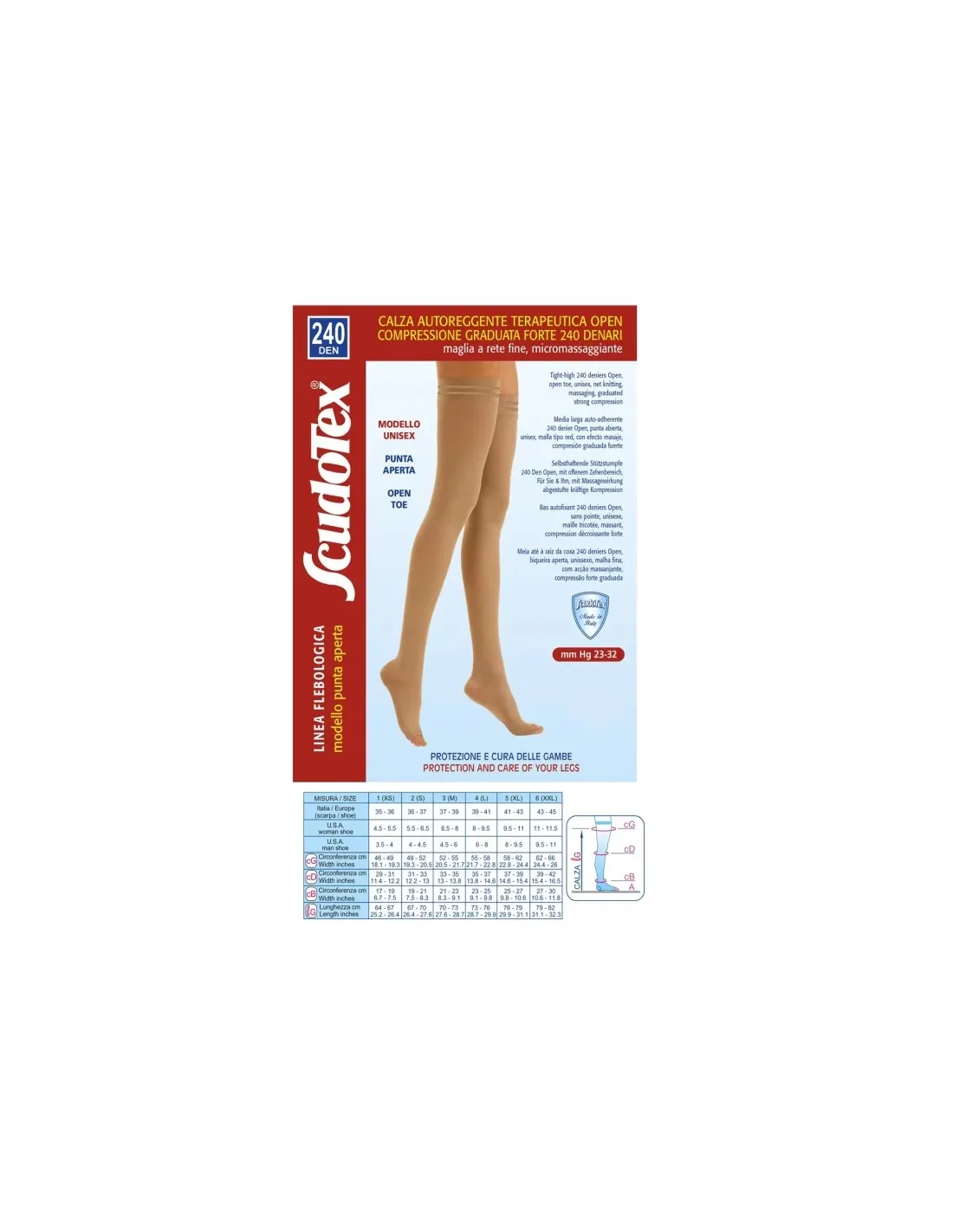 Autoreggente flebologico 240 denari punta aperta, maglia a rete (mm Hg 23-32) con speciale balza elastica siliconata antiscivolamento senza pizzo adatta sia alla donna che all’uomo.