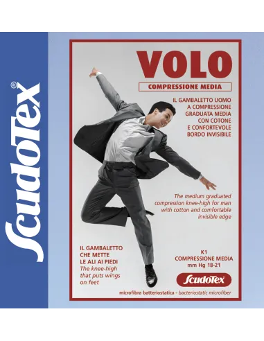 I gambaletti a compressione graduata Volo da uomo sono realizzati in cotone finissimo elasticizzato e microfibra batteriostatica agli ioni d’argento ideale per assorbire il sudore.