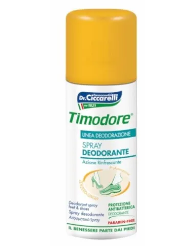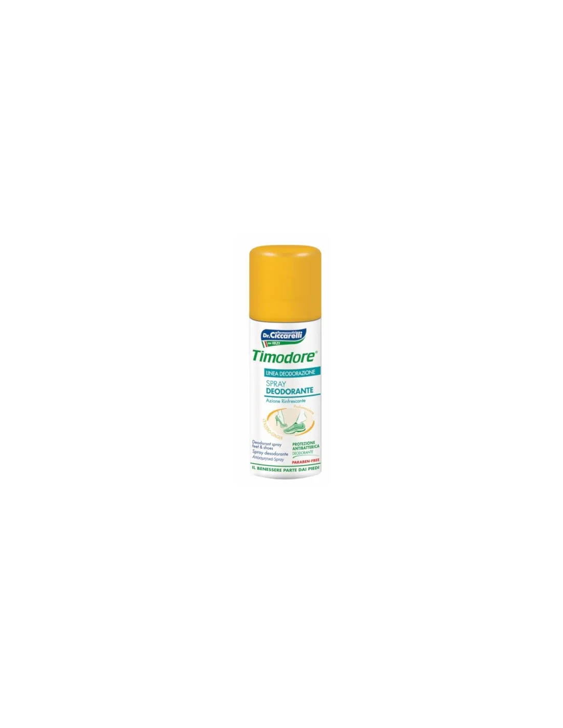 FARMACEUTICI DOTT.CICCARELLILo Spray Deodorante Timodore è particolarmente indicato per i ragazzi e per chi svolge una vita attiva e sportiva. Grazie infatti alla presenza di Estratto di Timo, dalle proprietà antibatteriche antisettiche e rinfrescanti previene il cattivo odore di piedi e calzature, dà sollievo a irritazioni e prurito, mantenendo i piedi freschi e deodorati per l’intera giornata.