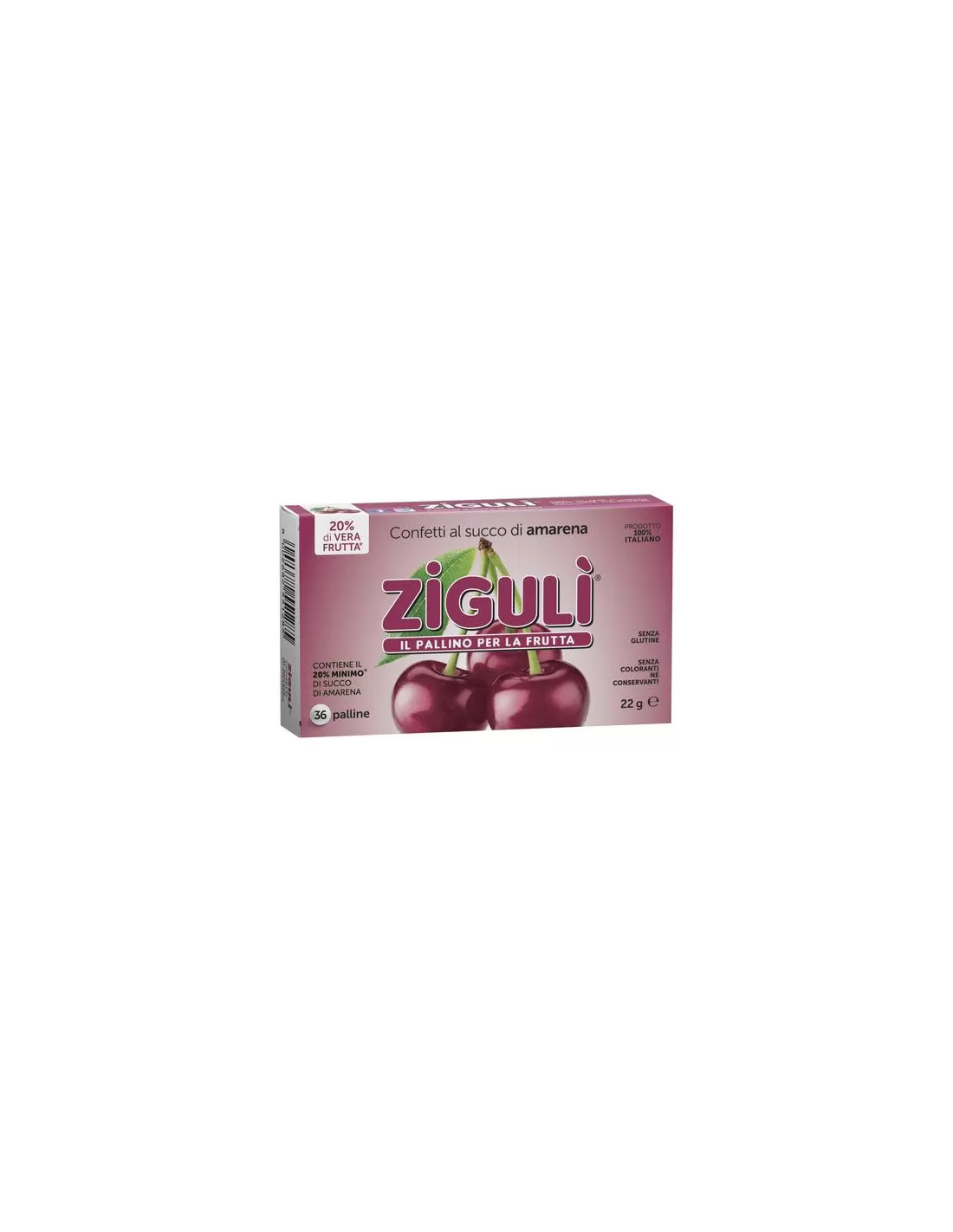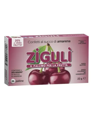 Confetti       al succo di amarena  zigulì Palline al succo di amarena senza coloranti, né conservanti. Senza glutine. Ingredienti Destrosio; zucchero; succo di amarena 20% (da succo concentrato e disidratato); sciroppo di glucosio; addensante: gomma arabica; aromi; acidificante: acido citrico; a...
