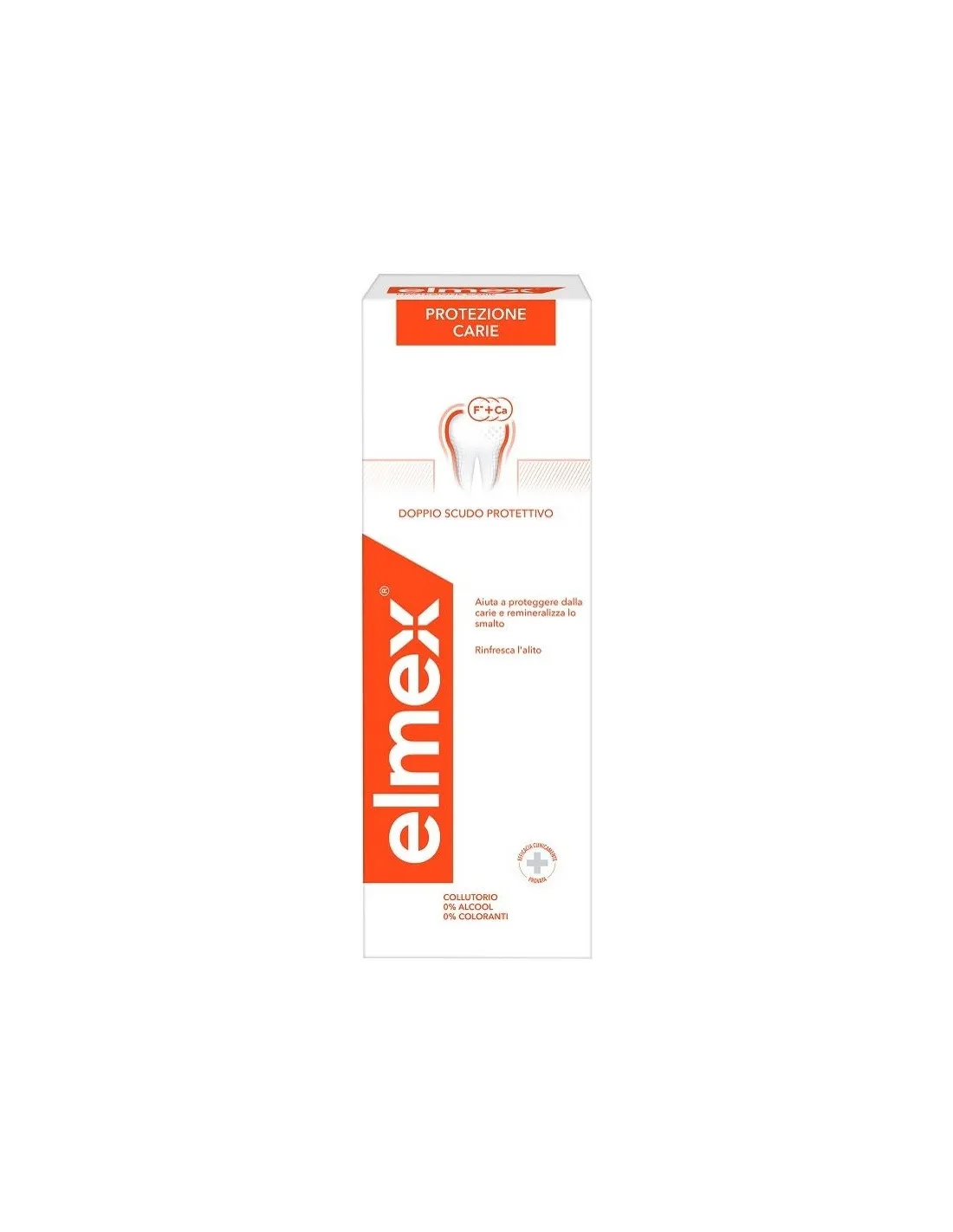 La formula di elmex con fluoruro amminico forma un duplice scudo attivo di calcio-fluoro, che remineralizza e protegge efficacemente dalla carie. E' uno dei pochi collutori senza alcol o coloranti.
