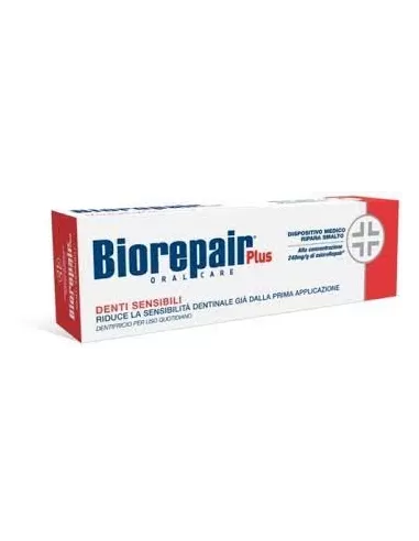 EURITALIA PHARMA (div.COSWELL)BIOREPAIR PLUS DENTI SENSIBILI Biorepair plus denti sensibili a cosa serve È un dispositivo medico che riduce la sensibilità dentinale già dalla prima applicazione. Dispositivo medico ripara smalto ad alta concentrazione di micro Repair - 240mg/g Per un rapido sollievo dal dolore provocato da una e...