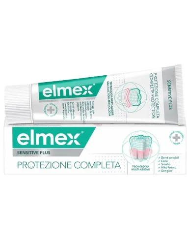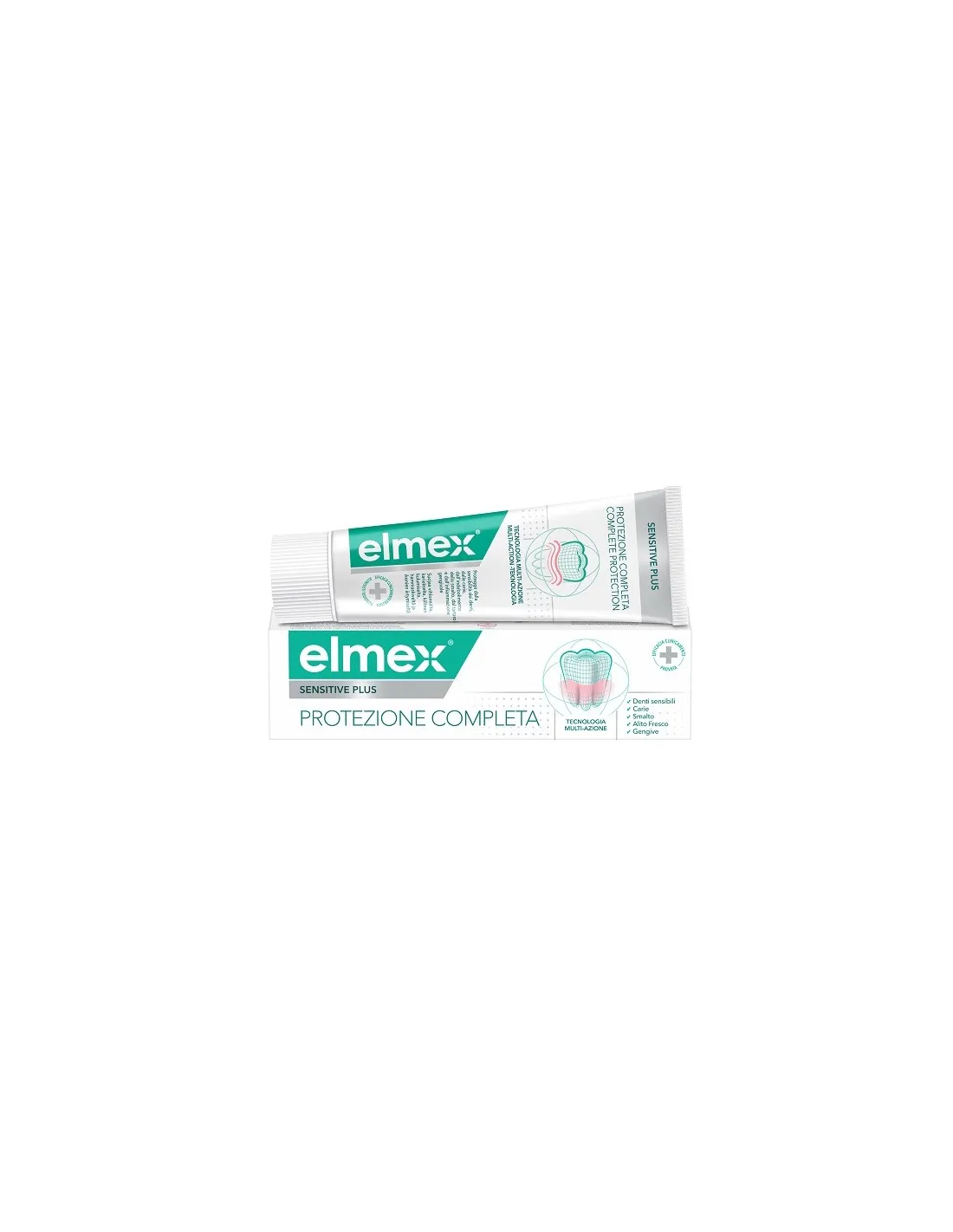 Prenditi cura in modo efficacie della tua bocca e dei denti sensibili con il dentifricio elmex Sensitive Plus Complete Protection. Questo dentifricio per la sensibilità contiene una tecnologia clinicamente testata al fluoruro stannoso e Fosfato di Zinco che fornisce protezione per aiutare a mantenere i denti forti e le gengive in salute, proteggendo i denti sensibili. Se usato quotidianamente, questo dentifricio per i denti sensibili protegge dalla carie e dall'irritazione delle gengive, rinforzando lo smalto e proteggendo dalla formazione dello smalto. Inoltre aiuta a restaurare il bianco naturale dei tuoi denti. Prenditi cura dei tuoi denti e della bocca con il dentifricio elmex Sensitive Plus Complete Protection.