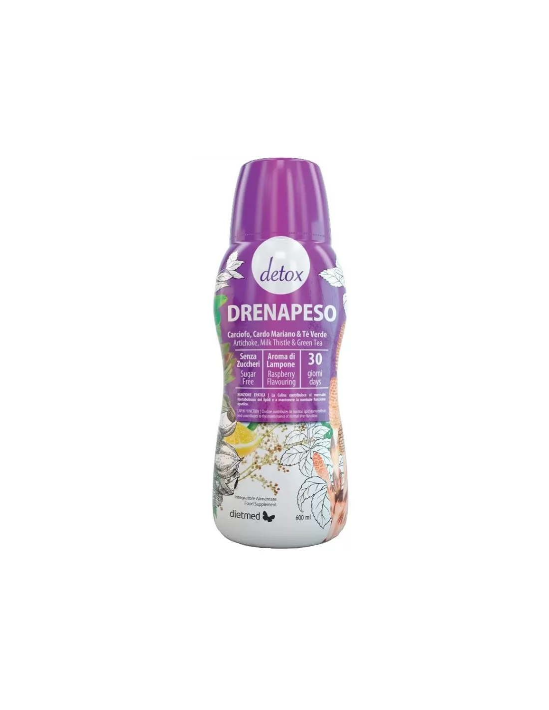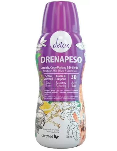 Ingredienti Acqua, Camellia sinensis L. (tè verde, estratto secco 8:1 di foglie), Equisetum arvense L. (equiseto, idrolato di gambo), Cynara scolymus L. (carciofo, estratto secco 10:1 di foglie), Silybum marianum L. (cardo mariano, estratto secco 25:1 di pianta), Cola nitida Vent. (cola, estratto secco 4:1 di semi), Paullinia cupana K. (guaranà, estratto secco 5:1 di semi), Hieracium pilosella L. (pilosella, estratto secco 6:1 di pianta), Filipendula ulmaria L. (olmaria, estratto secco 5:1 di sommità fiorite), Rhamnus frangula L. (frangola, estratto secco 5:1 di corteccia), Melissa officinalis L. (melissa, estratto secco 4:1 di foglie e steli), Foeniculum vulgare Mill. (finocchio, estratto secco 4:1 di frutti), Citrus limon L. (limone, idrolato di scorza), Taraxacum officinale L. (tarassaco, estratto secco 10:1 di radici), Acacia senegal L. (acacia, contenente fibre), aroma di lampone/ananas; conservante: sodio benzoato; bitartrato di colina; conservante: sorbato di potassio; correttore di acidità: acido citrico; dolcificante: acesulfame K e sucralosio.