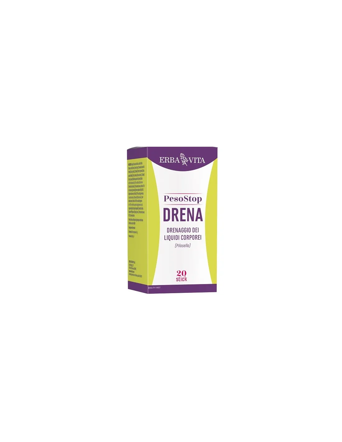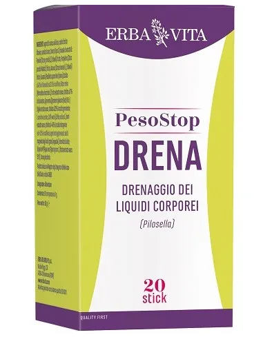 ERBA VITA GROUP SpAPeso Stop Drena è un integratore alimentare a base di estratti vegetali, in particolare Pilosella, Orthosiphon, Verga d’oro e Lespedeza supportano il drenaggio dei liquidi corporei. La formulazione è arricchita con Centella e Rusco favoriscono la funzionalità del microcircolo e Betulla e Carciofo coadiuvano la fisiologica depurazione dell’organismo.