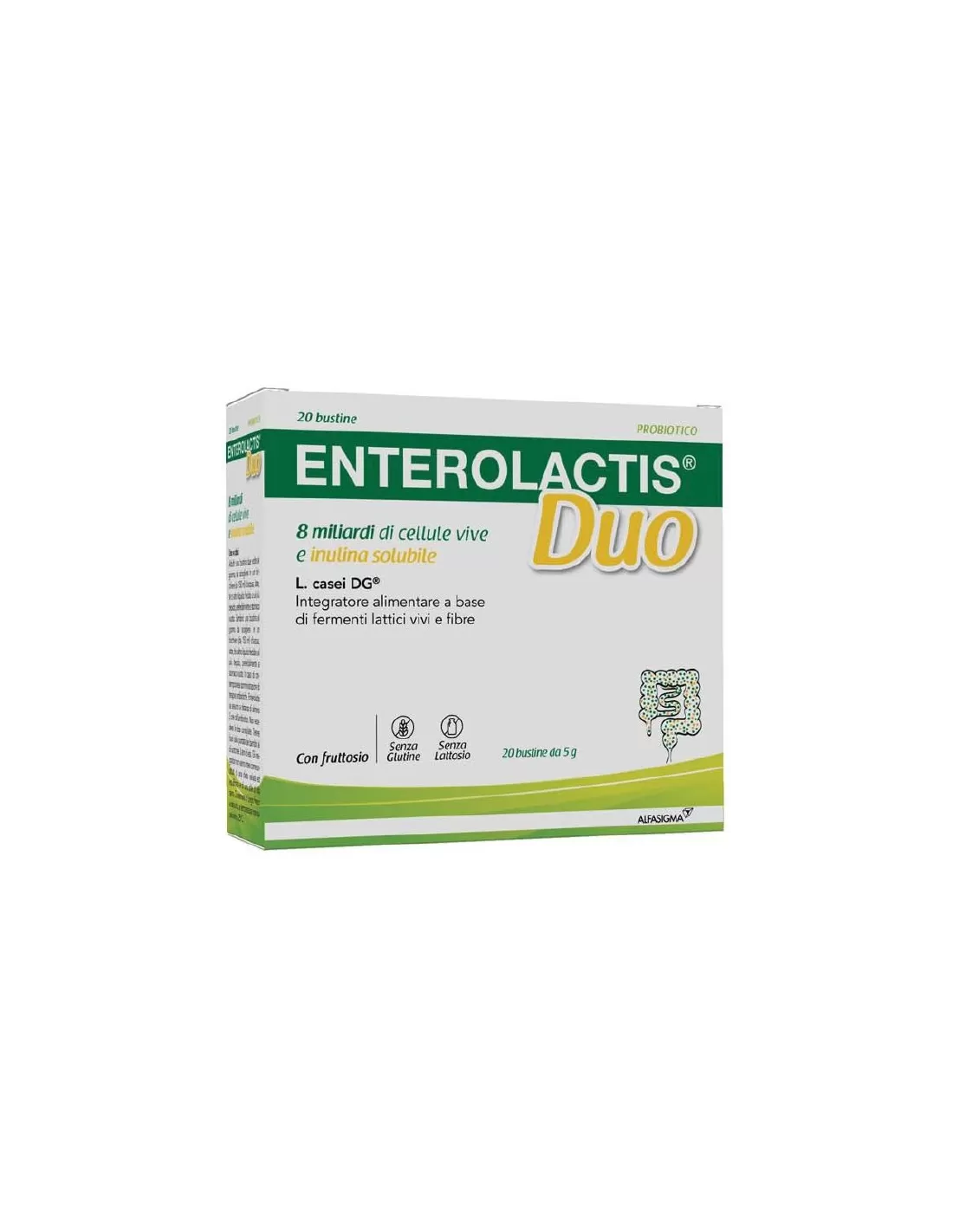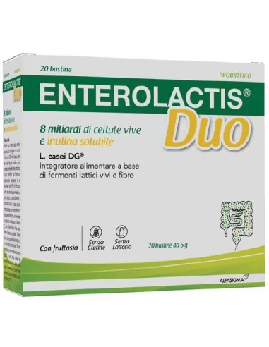 ALFASIGMA ENTEROLACTIS DUO 20 BUSTINE 5 G Integratore alimentare a base di fermenti lattici vivi. L’apporto dietetico di probiotici è indicato nel riequilibrio della flora batterica intestinale conseguente ad abitudini alimentari scorrette o terapie antibiotiche. Ingredienti Inulina solu...