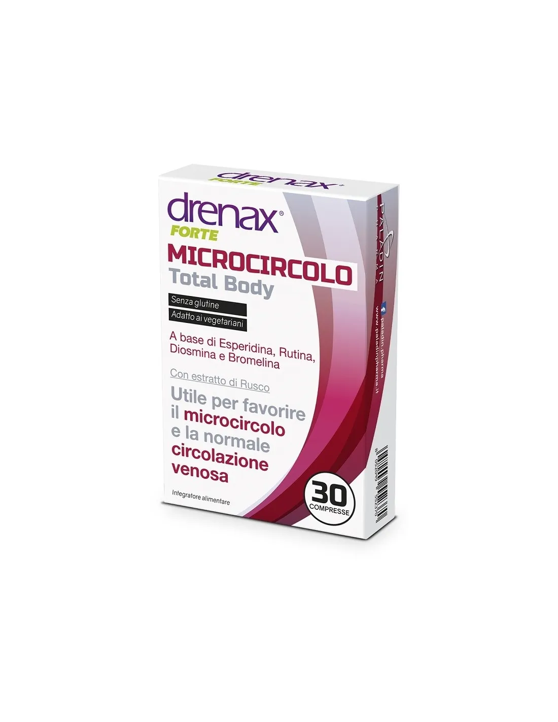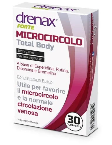 Drenax Forte Microcircolo Total Body Compresse è un integratore alimentare a base di Flavonoidi (Esperidina, Diosmina, Rutina), Bromelina ed estratto vegetale di Rusco.