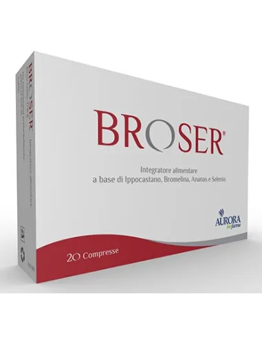 AURORA LICENSING SrlBroser compresse è un integratore alimentare a base di Ippocastano, Maltodestrine fermentate da Serratia, Bromelina, Ananas e Selenio.