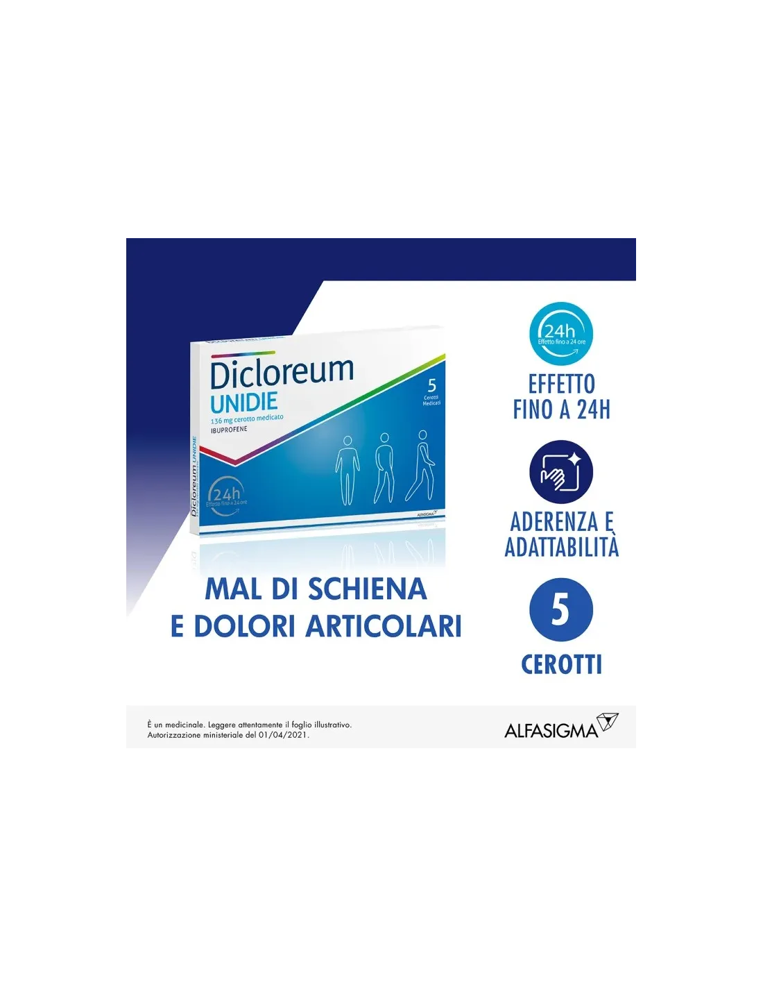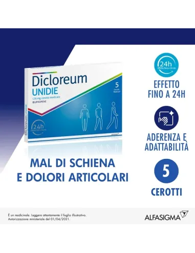 Dicloreum Unidie viene venduto in Confezione da 5 cerotti medicati.