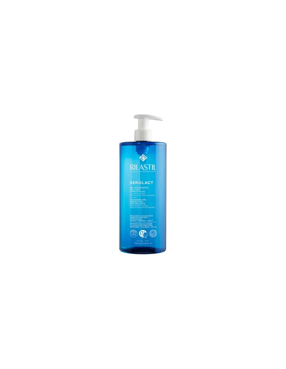Rilastil Xerolact Gel Detergente, delicato gel schiumogeno a pH fisiologico (5,5), indicato per la detersione quotidiana di pelli secche, molto secche, soggette ad arrossamento, desquamazione, prurito ed irritazioni. Deterge la cute, senza impoverire il film idro-lipidico cutaneo.