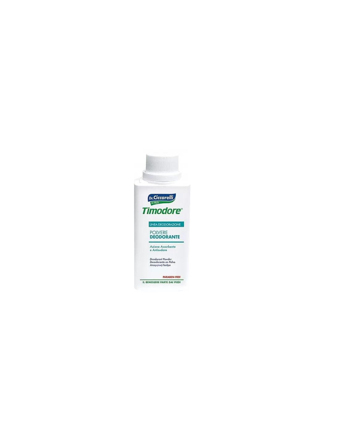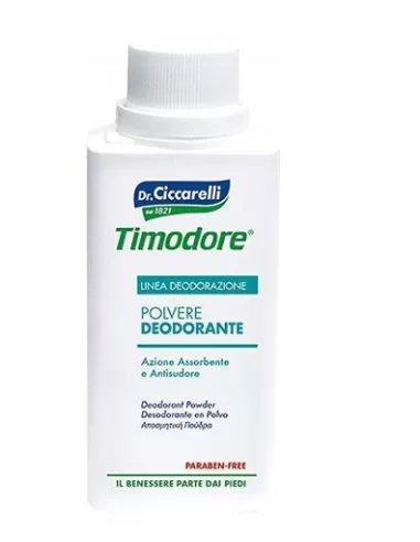 Timodore DETERGENTE DEODORANTEIndicazioni: previene ed elimina il cattivo odore dei piedi dovuto alla decomposizione batterica del sudore.Caratteristiche: contiene: - sale rameico dell'acido usnico, a spiccata azione antibatterica; - timo e lavanda, agenti dermopurificanti e antimicrobici; - vitamin...