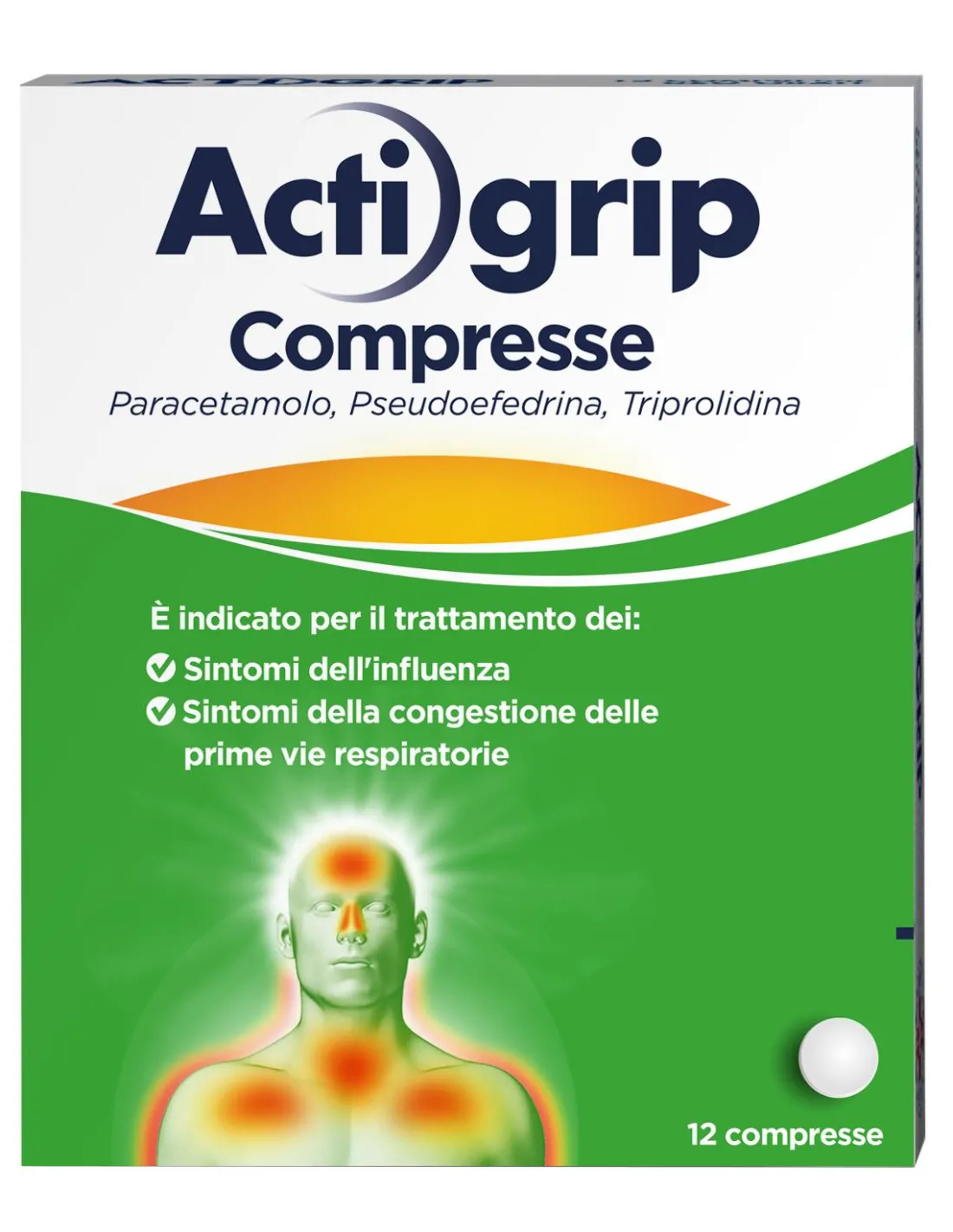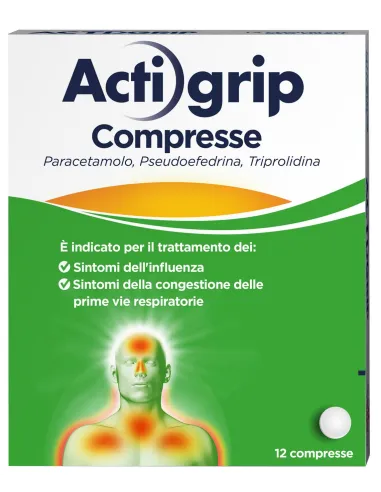 JOHNSON & JOHNSON SpAActigrip contiene tre principi attivi: il paracetamolo che svolge la sua funzione alleviando il dolore e abbassando la febbre, la pseudoefedrina cloridrato è un decongestionante per il naso chiuso e la triprolidina cloridrato è un antistaminico che riduce la secrezione del naso e dilata i bronchi. Quindi Actigrip compresse svolge una tripla azione. Actigrip è utilizzato per il trattamento della sintomatologia da raffreddamento caratterizzata da ostruzione nasale, rinorrea acquosa, cefalea e/o febbre. Actigrip deve essere usato dagli adulti e dai bambini di età superiore 12 anni. Si rivolga al medico se non si sente meglio o si sente peggio dopo 3-5 giorni di trattamento