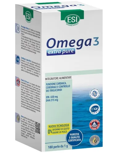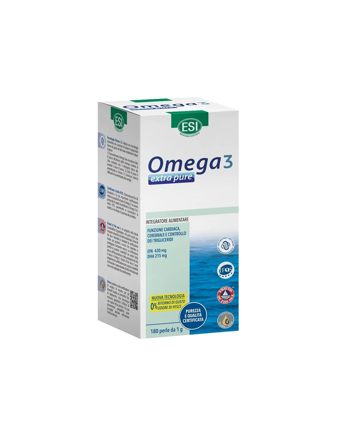 Integratore alimentare contenente olio di pesce ad alta concentrazione ricco in omega 3, utili in molti processi fisiologici, per la salute del sistema cardiocircolatorio, ma anche della pelle. Omega 3 extra pure è indicato per diminuire il rischio di malattie cardiovascolari: utile in caso di metabolismo lipidico alterato, con elevati tassi ematici di colesterolo e trigliceridi, contrasta efficacemente l'insorgere dell'aterosclerosi. L'esclusiva tecnologia trifase elimina completamente lo spiacevole odore di pesce ed il ritorno di gusto. Il prodotto ha ricevuto le certificazioni IFOS, FOS e ORIVO.