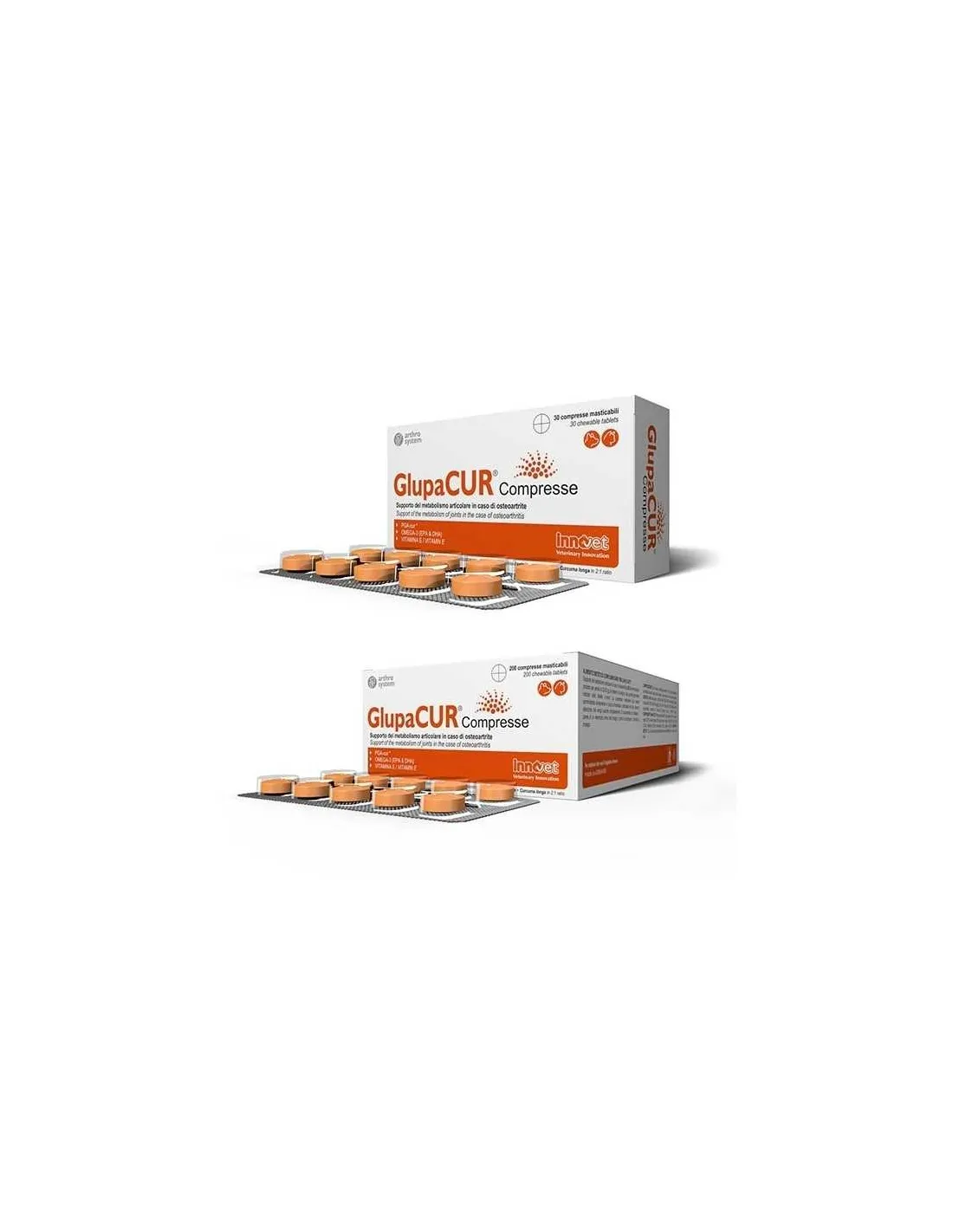 INNOVET ITALIA SrlGlupacur 30 Compresse di Innovet è un Supporto del metabolismo articolare in caso di osteoartrite. Per cani e gatti di ogni età affetti da osteoartrite. Grazie all’esclusivo micro composito* formato da palmitoil-glucosamina ed estratto di Curcuma, Glupacur Compresse supporta il metabolismo articolare di cani e gatti affetti da osteoartrite, migliorandone la qualità di vita.