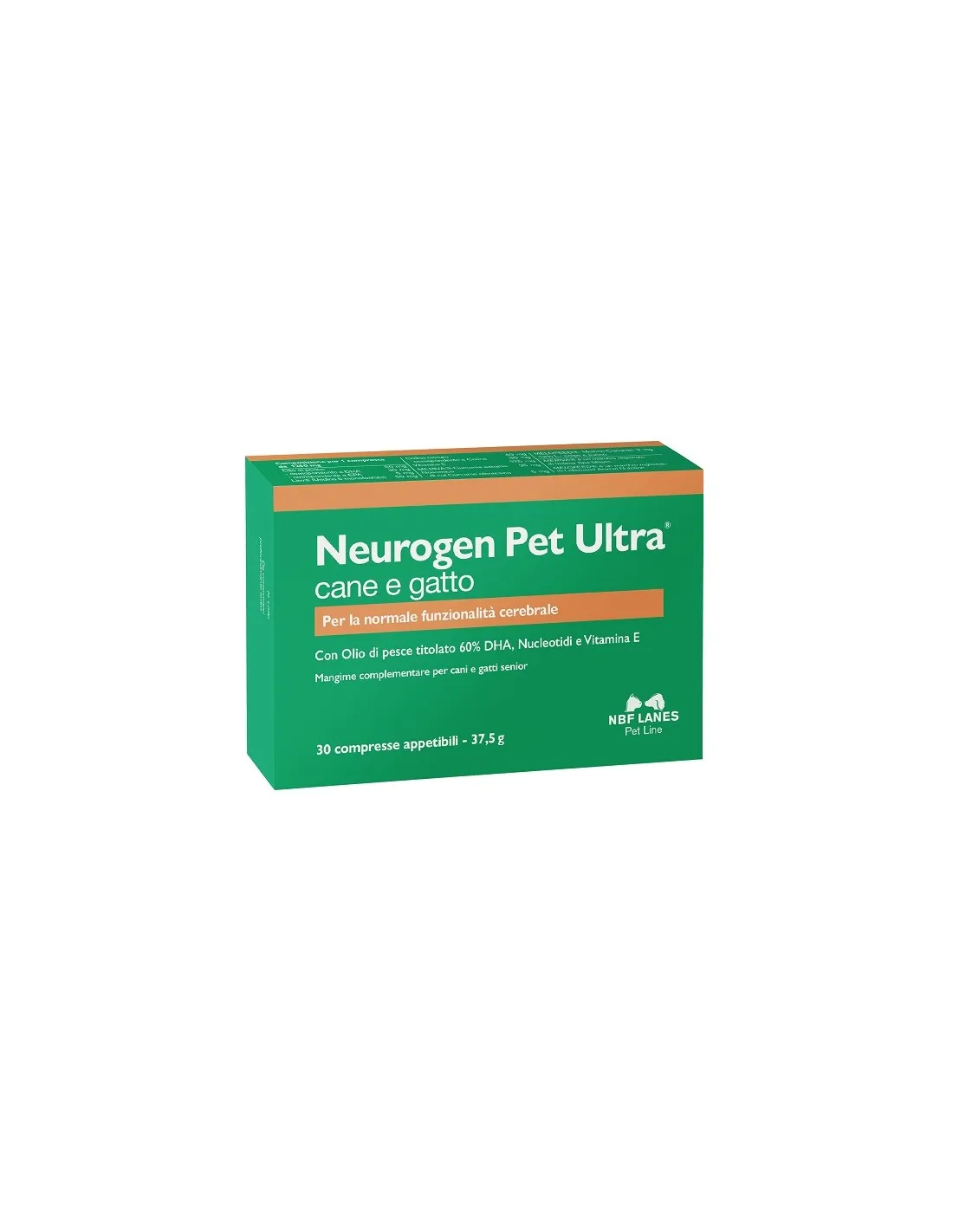 N.B.F. LANES SrlNeurogen Pet Ultra, per la normale funzionalità cerebrale. Mangime complementare per cani e gatti senior con Olio di Pesce titolato 60% DHA, Nucleotidi e Vitamina E.
