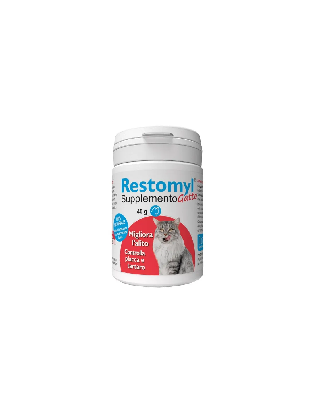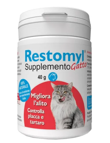 Ascophyllum nodosum), il cui uso è stato brevettato e i cui benefici sulla salute del cavo orale sono stati dimostrati specificatamente nell'animale da compagnia. L'alga bruna viene assorbita dopo somministrazione orale e, attraverso la circolazione, raggiunge le ghiandole salivari per concentrarsi nella saliva. Qui impedisce la crescita sulla superficie dentaria della componente batterica della placca e riduce la deposizione del tartaro. Il primo segno di un miglioramento della salute orale è la scomparsa dell'alito cattivo. Restomyl Supplemento non contiene alcun ingrediente che maschera il cattivo odore dell'alito. Il fucoidano riduce la formazione della placca; gli esteri di solfato riducono la deposizione del tartaro.