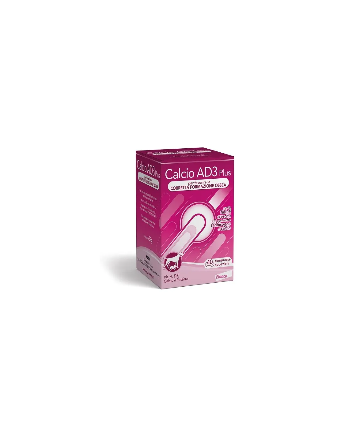 ELANCO ITALIA SpAIntegratore di vitamine e acidi grassi essenziali per favorire la corretta formazione ossea nella fase di crescita. Questo prodotto è caratterizzato dalla presenza di dosi adeguate a coprire i fabbisogni giornalieri di vitamina A e di vitamina D3, ed all'apporto totale di calcio e di fosforo in grado di riequilibrare le reazioni casalinghe dei cuccioli. Garantisce un'ottima assimilabilità in quanto vengono utilizzate fonti di calcio (lattato) più facilmente assorbibili e un'elevata appetibilità grazie all'impiego di ingredienti di prima qualità e sostanze naturali, quali l'estratto secco di fegato. Il suo formato in compresse e la solubilità in acqua, infine, ne facilitano il dosaggio e la somministrazione.