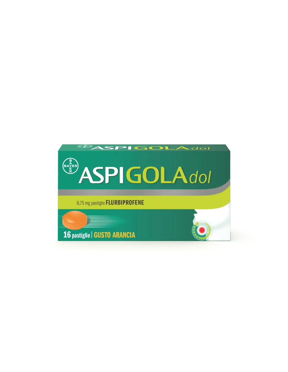 BAYER SpAAspi Gola Pastiglie è a base di flurbiprofene, un medicinale antinfiammatorio e antidolorifico. Aspi Gola svolge un’azione rapida sul mal di gola con un triplice effetto contro infiammazione, dolore e difficoltà a deglutire per un’azione fino a 6 ore. Aspi Gola Pastiglie per mucosa orale può essere assunto da adulti e bambini dai 12 anni di età. Al gusto arancia.