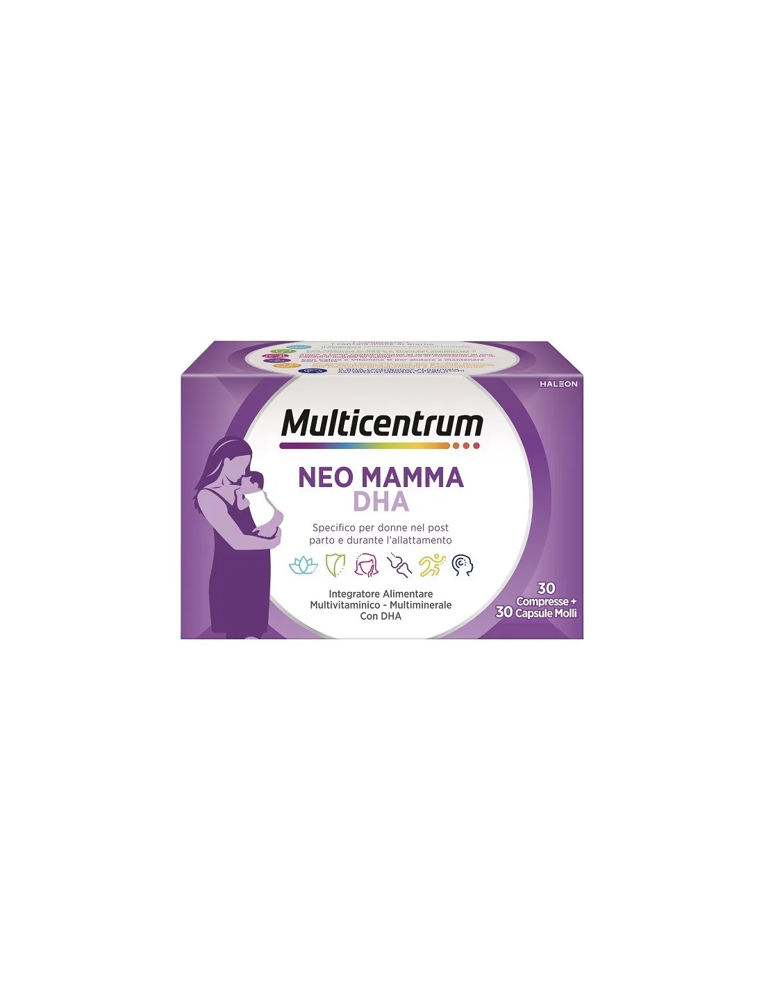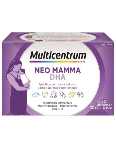 È un integratore alimentare multivitaminico e multiminerale adatto alle donne nel periodo post parto e allattamento. La formulazione di Multicentrum Neo Mamma DHA è una fonte di vitamine e minerali che forniscono numerosi benefici per la donna nei mesi successivi al parto.