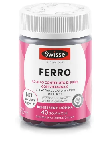 Swisse Ferro Integratore Benessere Donna 40 gommose è un integratore alimentare di ferro. Deliziose pastiglie gommose all'aroma naturale di uva formulate con ferro, che contribuisce alla normale formazione dei globuli rossi e dell'emoglobina e alla riduzione di stanchezza e affaticamento, e vitamina C che accresce l’assorbimento del ferro.