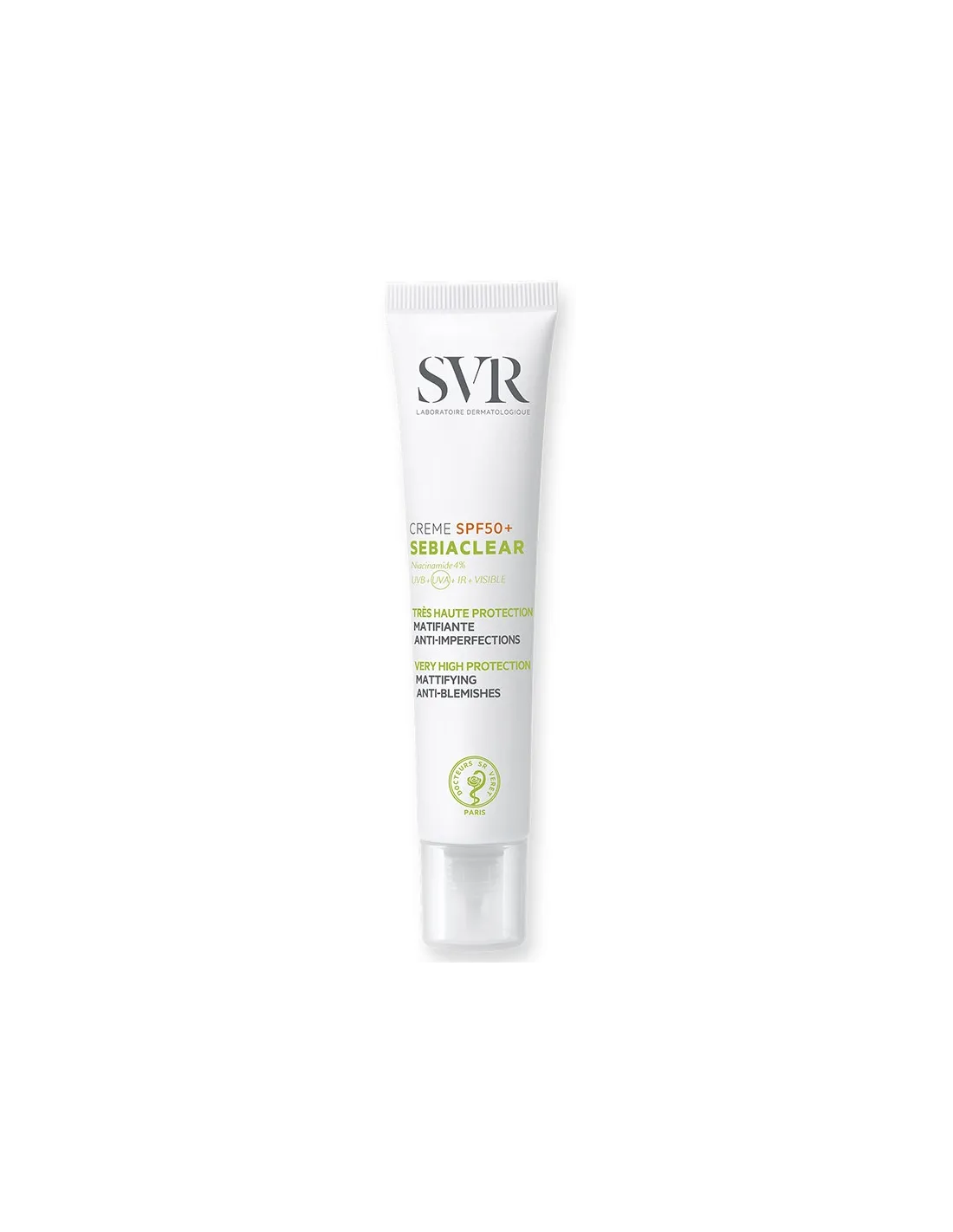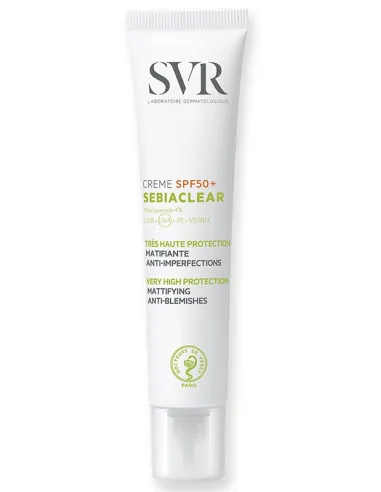 Sebiaclear Crème SPF50 protegge le pelli miste/grasse dalle imperfezioni. Limita la produzione di sebo, previene l’ispessimento della grana cutanea per evitare l’effetto rebound e la comparsa di macchie scure o rosse indotte dall’esposizione ai raggi UV. Texture vellutata, priva di olii, dry-touch (asciutta al tatto). Per pelli da miste a grasse, con imperfezioni, esposte ai raggi UV, viso. Alta protezione solare opacizzante e anti-imperfezioni.