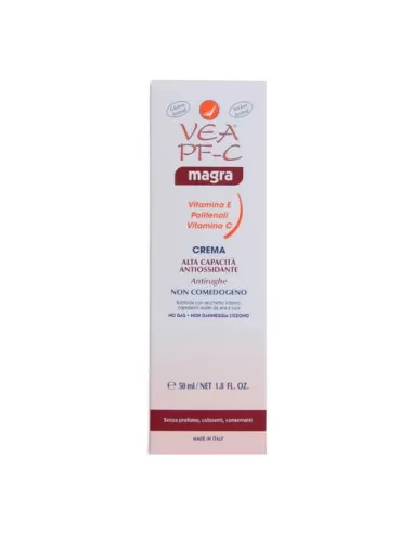 Utilizzata per viso, contorno occhi, zona periorale e collo, anche in condizioni di cute arrossata. Impiegata come antirughe e contro le discromie cutanee. Contribuisce ad attenuare i fenomeni di invecchiamento cutaneo e i danni estetici da senescenza per sovraesposizione solare, da radicali liberi e da inquinanti ambientali. Protezione quotidiana dallo stress cutaneo. VEA PF-C MAGRA, usata costantemente, aiuta a mantenere o a migliorare la tonicità, la luminosità e la vitalità della pelle. Può contribuire a prevenire e ad attenuare le smagliature.