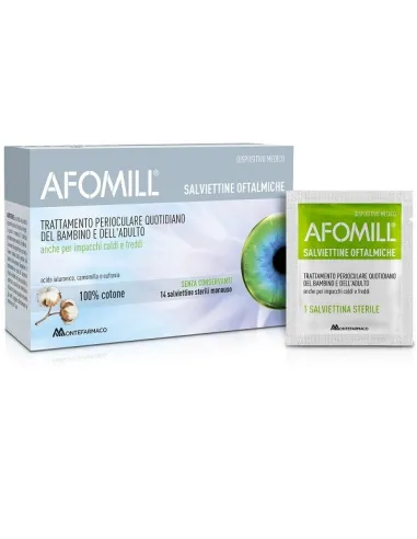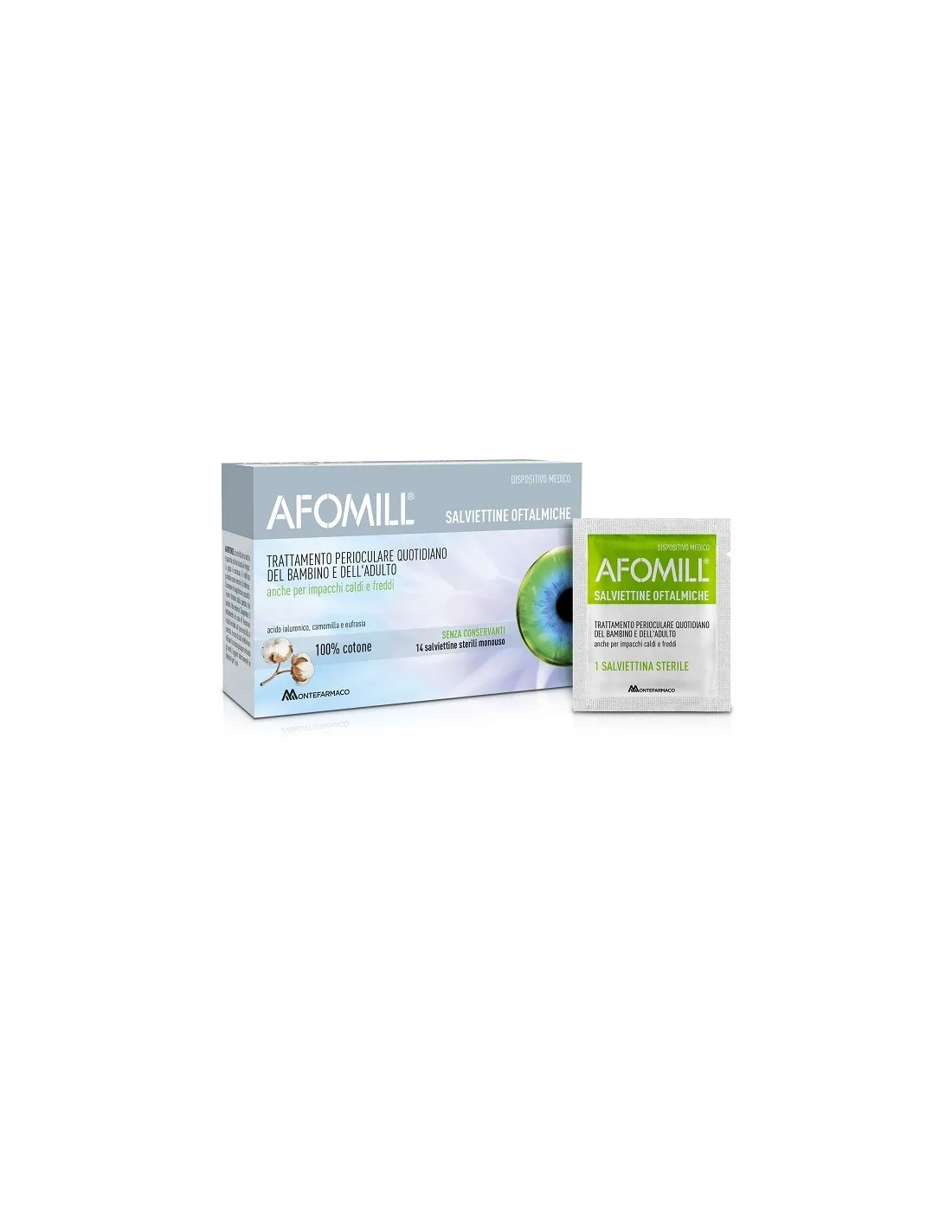 Tutti i componenti di AFOMILL SALVIETTINE OFTALMICHE risultano utili per ottenere un ottimale trattamento nel pieno rispetto della particolare fisiologia della zona perioculare, particolarmente delicata e sensibile. Il prodotto è in grado di operare un trattamento accurato rimuovendo meccanicamente le secrezioni, eventuali corpi estranei, polvere ecc.