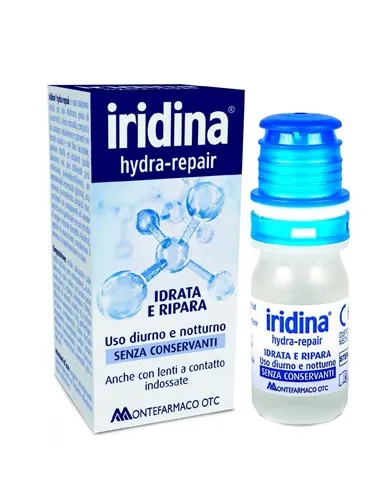 MONTEFARMACO OTC SpAIridina hydra-repair è indicato per l’attenuazione della sintomatologia dell’occhio secco, di forma moderata, dovuta sia a cause estrinseche che intrinseche quali: • Condizioni ambientali e climatiche sfavorevoli come l’uso dell’aria condizionata (in macchina, in ufficio, in casa), forte vento, l’inquinamento atmosferico ed il clima molto caldo; • Terapia locale cronica con colliri contenenti conservanti;