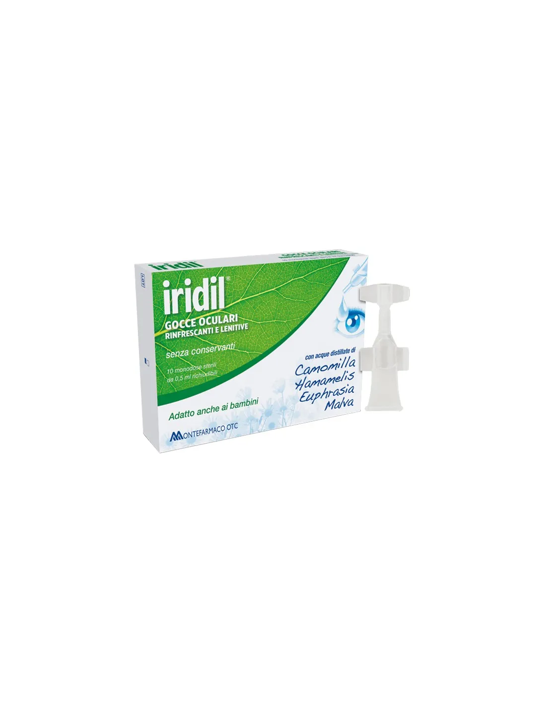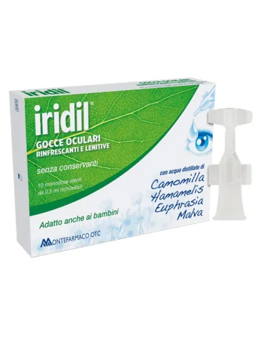 MONTEFARMACO OTC SpAlridil gocce oculari si presenta in confezioni sterili da 0,5 ml contenenti Acqua distillata di Hamamelis, Camomilla, Euphrasia, dalle proprietà rinfrescanti e lenitive e Acqua distillata di Malva dall'effetto antiarrossante e protettivo. L'azione combinata di questi elementi naturali allevia l'arrossamento oculare dovuto a cause ambientali quali vento, esposizione prolungata ai raggi solari, fumo, inquinamento, aria secca, salsedine, attività sportive ma anche da affaticamento visivo dovuto a numerose ore di studio e lavoro, eccessivo uso del computer ed esposizione alla luce. lridil gocce oculari può essere utilizzato anche nei bambini e da chi porta lenti a contatto.