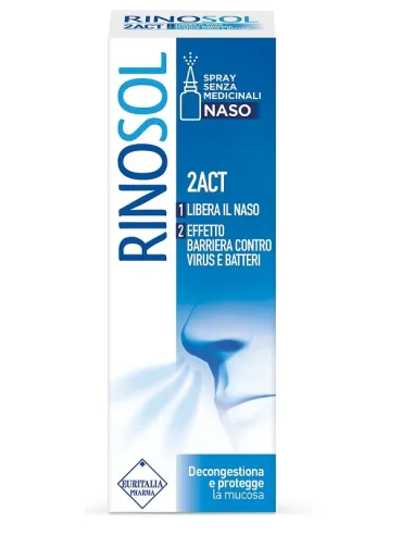 Il dispositivo medico Rinosol 2ACT è uno spray nasale senza propellente pronto all’uso. Per un utilizzo corretto è necessario rimuovere il tappo e, tenendo sia il capo che il flacone in senso verticale, introdurre l’apertura del beccuccio erogatore all’interno della narice, senza affondare eccessivamente all’interno della cavità nasale. Premere con due dita sulla base dell’erogatore ed inspirare contemporaneamente alla fuoriuscita della soluzione. Per facilitare la comprensione del corretto utilizzo del prodotto, la corretta modalità d’uso è riportata anche in forma grafica. Per favorire una distribuzione omogenea del prodotto è utile massaggiare lievemente il naso dall’esterno con movimenti longitudinali dal basso verso l’alto. Al primo utilizzo, per eliminare l’aria dall’erogatore, premere più volte fuori dalle narici. Agitare il flacone prima dell’uso. L’applicazione sui bambini deve essere effettuata da un adulto. Dopo l’uso sciacquare con acqua corrente il beccuccio erogatore e asciugarlo prima di richiuderlo utilizzando l’apposito tappo.