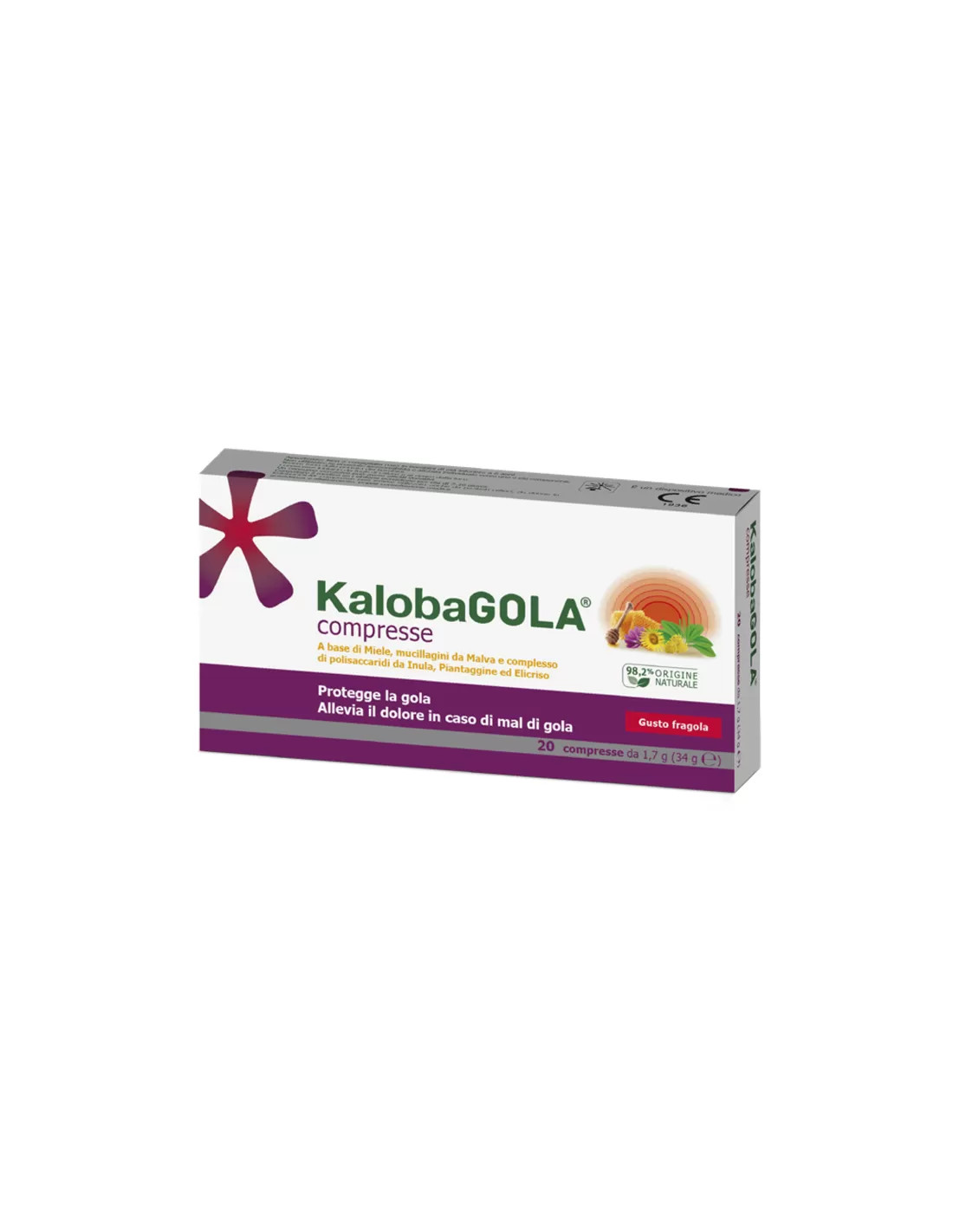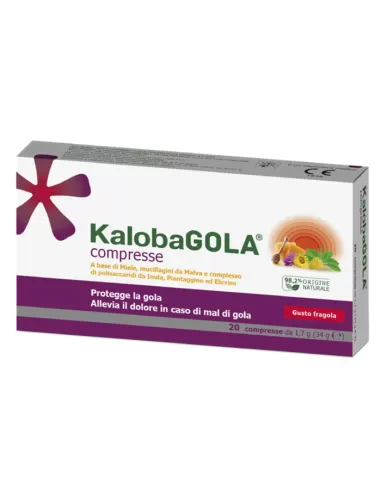 KalobaGola è un Trattamento balsamico mal di gola in compresse al gusto fragola, che svolge un’azione emolliente e lenitiva in caso di mal di gola quindi svolge un'azione di attenuazione degli stati infiammatori di faringe e laringe.