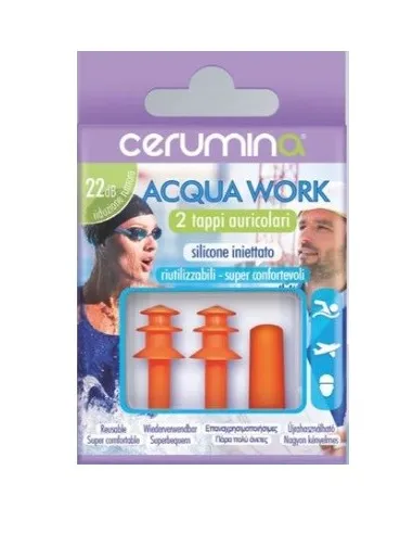 CERUMINA Acqua work Tappo auricolare in SILICONE INIETTATO. Questo tappo riduce il rumore ambientale di 22 Decibel. È una barriera contro acqua e rumore. È adatto anche per l’utilizzo in ambienti lavorativi rumorosi. La confezione contiene 2 tappi auricolari. I tappi auricolari sono riutilizzabili. I tappi sono dotati di un astuccio plastico richiudibile inserito in un astuccio in cartoncino dotato di appendino. È un dispositivo di protezione individuale
