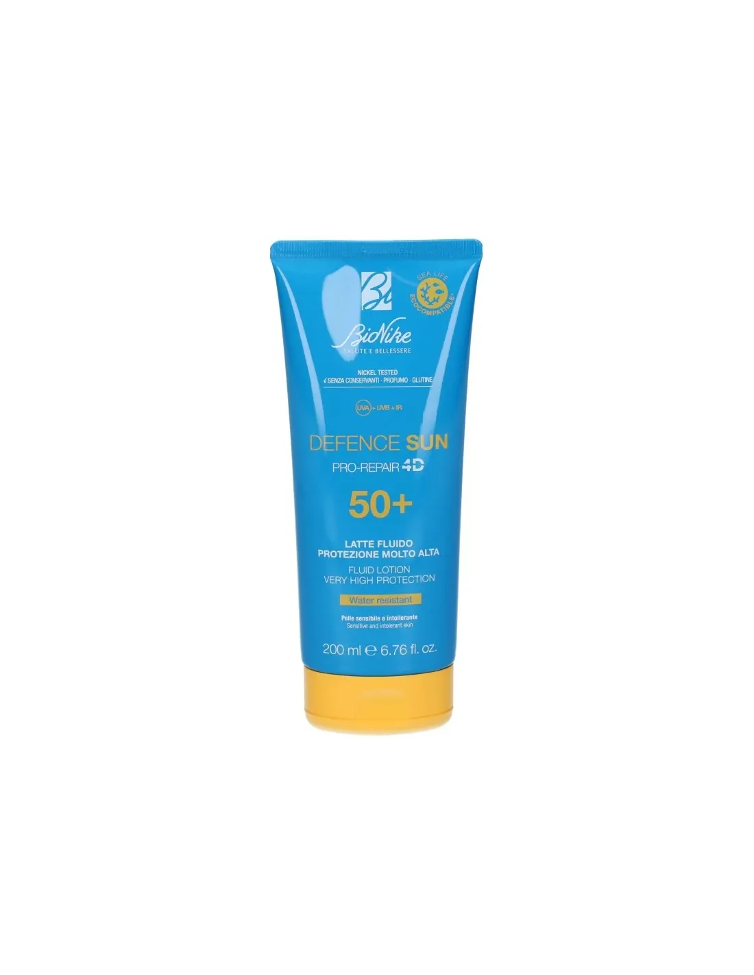 I.C.I.M. (BIONIKE) INTERNATIONNuove formule DEFENCE SUN con tecnologia PRO-REPAIR 4D: Sistema filtrante esteso ed esclusivo Complesso brevettato NBCS* per garantire una fotoprotezione su 4 dimensioni proteggendo la pelle dai danni a breve e lungo termine. Texture fluida e leggera a rapido assorbimento. Texture fluida e leggera a rapido assorbimento per la pelle delicata. Resistente all'acqua e alla sabbia.