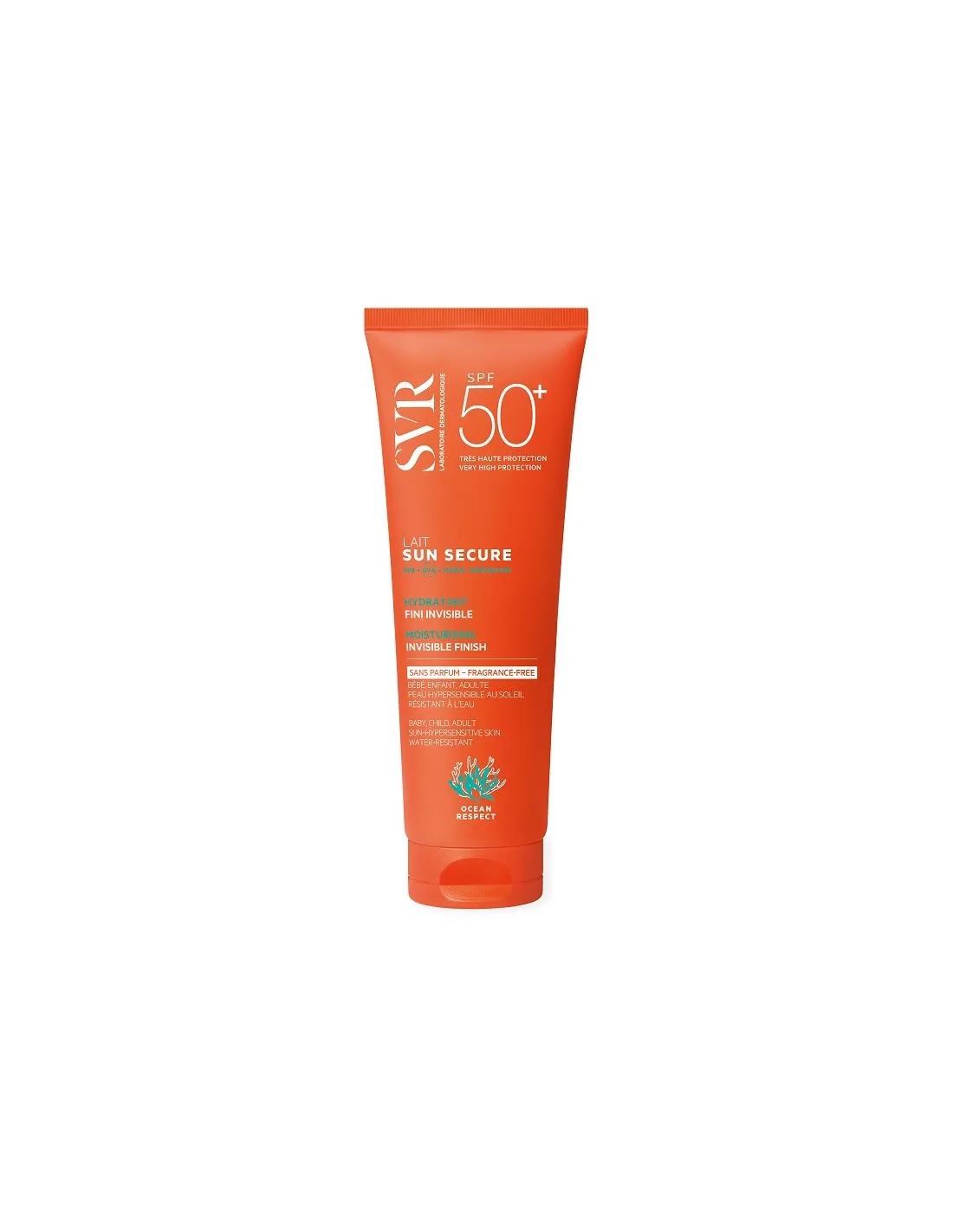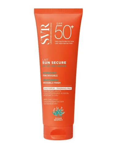 LABORATOIRES SVRSUN SECURE Lait SPF50+ garantisce un'elevata protezione solare dermatologica grazie alla nuova combinazione di filtri brevettata che rispetta l'ambiente marino e i meccanismi endocrini valutati. Senza compromessi sulla texture piacevole e sensoriale! Finish invisibile: nessuna traccia bianca. INNOVAZIONE SUN SECURE : PROTEZIONE TRASPARENTE. UVB + UVA + VISIBILE + INFRAROSSO