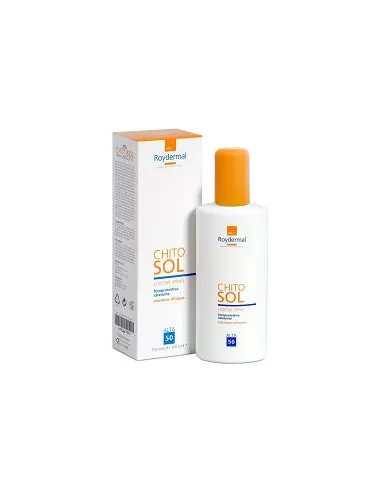 Roydermal     CHITO      SOL    LOZIONE SPRAY Dispositivo Medico CE.Emulsione protettiva per uso topico. Emulsione solare, con funzione barriera, ricca di filtri meccanici e chimici, in grado di schermare la pelle dai danni nocivi delle radiazioni solari (ALTA 50). CHITOSOL Lozione Spray SPF 50, fot...