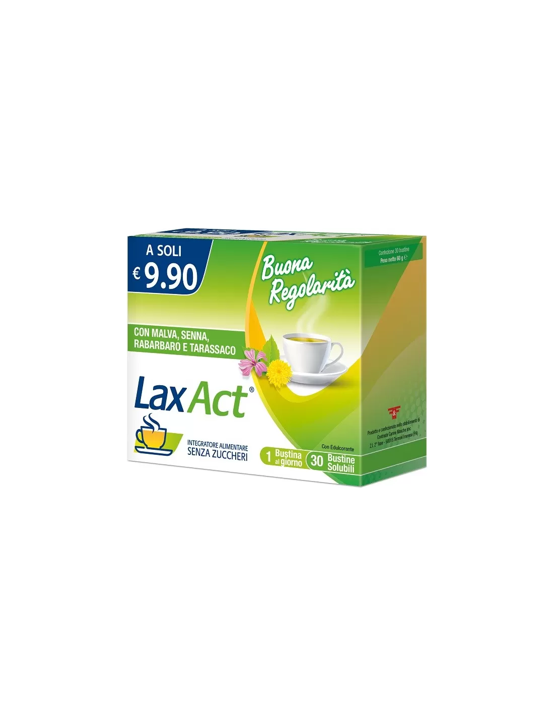 Ingredienti Agente di carica: sorbitolo; aroma, tarassaco (Taraxacum officinale Weber, radice) e.s. ¼; agente antiagglomerante: biossido di silicio; senna (Cassia angustifolia Vahl, foglie) e.s. tit. 20% in sennosoidi totali, malva (Malva sylvestris L., foglia) e.s. tit. 25% in polisaccaridi, rabarbaro (Rheum palmatum L. var. tagunticum, radice) e.s. tit. 5% in reina; stabilizzante: amido di mais; edulcorante: sucralosio.