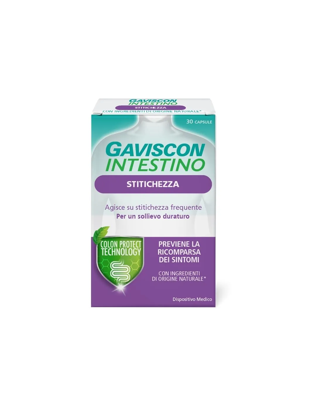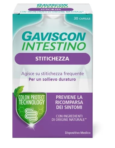 Gaviscon Intestino e Stitichezza, grazie all'esclusiva tecnologia Colon Protect, grazie alla combinazione dello Xiloglucano, derivato naturale dei semi di tamarindo, con la proteina di pisello, agisce sulle pareti dell’intestino formando un film protettivo che aiuta a ripristinare le funzioni fisiologiche della parete intestinale. Tale combinazione, mediante la sua azione muco adesiva che genera un effetto barriera, riduce l’aumentata permeabilità della barriera intestinale e impedisce agli agenti patogeni di aderirvi, evitando, quindi, la loro proliferazione e favorendone l’eliminazione attraverso il transito intestinale. Il ripristino della corretta permeabilità intestinale e l’eliminazione dei patogeni promuove la regolare motilità e riduce l’ipersensibilità della parete addominale. La polvere di Semi di Chia è un lassativo naturale che aumenta la massa fecale nell’intestino favorendone il transito e regolarizzando la motilità del tratto intestinale.