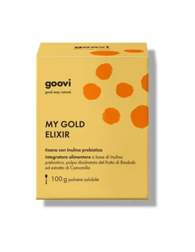 Goovi My Gold Elixir è un Integratore alimentare a base di inulina, polpa disidratata del frutto di baobab ed estratto di camomilla ad alta concentrazione (rapporto 6:1)*. In polvere solubile da sciogliere in acqua calda, si beve come una tisana, sia calda che fredda. Prodotto indicato come "elisir" quotidiano: rinfresca l'intestino e favorisce l'equilibrio della flora intestinale grazie all'inulina prebiotica; la polpa disidratata del frutto di baobab è ad azione di sostegno e ricostituente; l'estratto di camomilla favorisce il rilassamento, la digestione e l'eliminazione dei gas. Per la sua formulazione originale, rappresenta una tisana di alto valore per l'organismo femminile. Adatto a vegani.