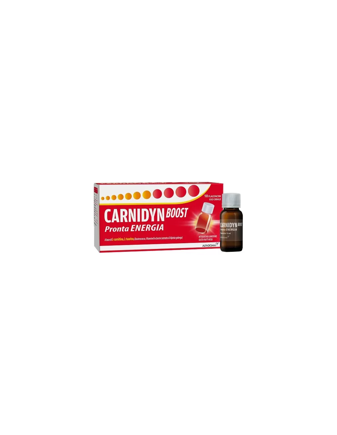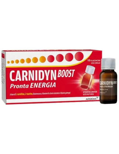 ALFASIGMA CARNIDYN BOOST 10 FLACONCINI Integratore alimentare a base di L-carnitina, L-taurina, vitamine del gruppo B, eleuterococco e EnXtra, con zucchero ed edulcorante. Utile per riattivare velocemente l'organismo e fornire tutta la carica extra che serve. Ha una formulazione equilibr...
